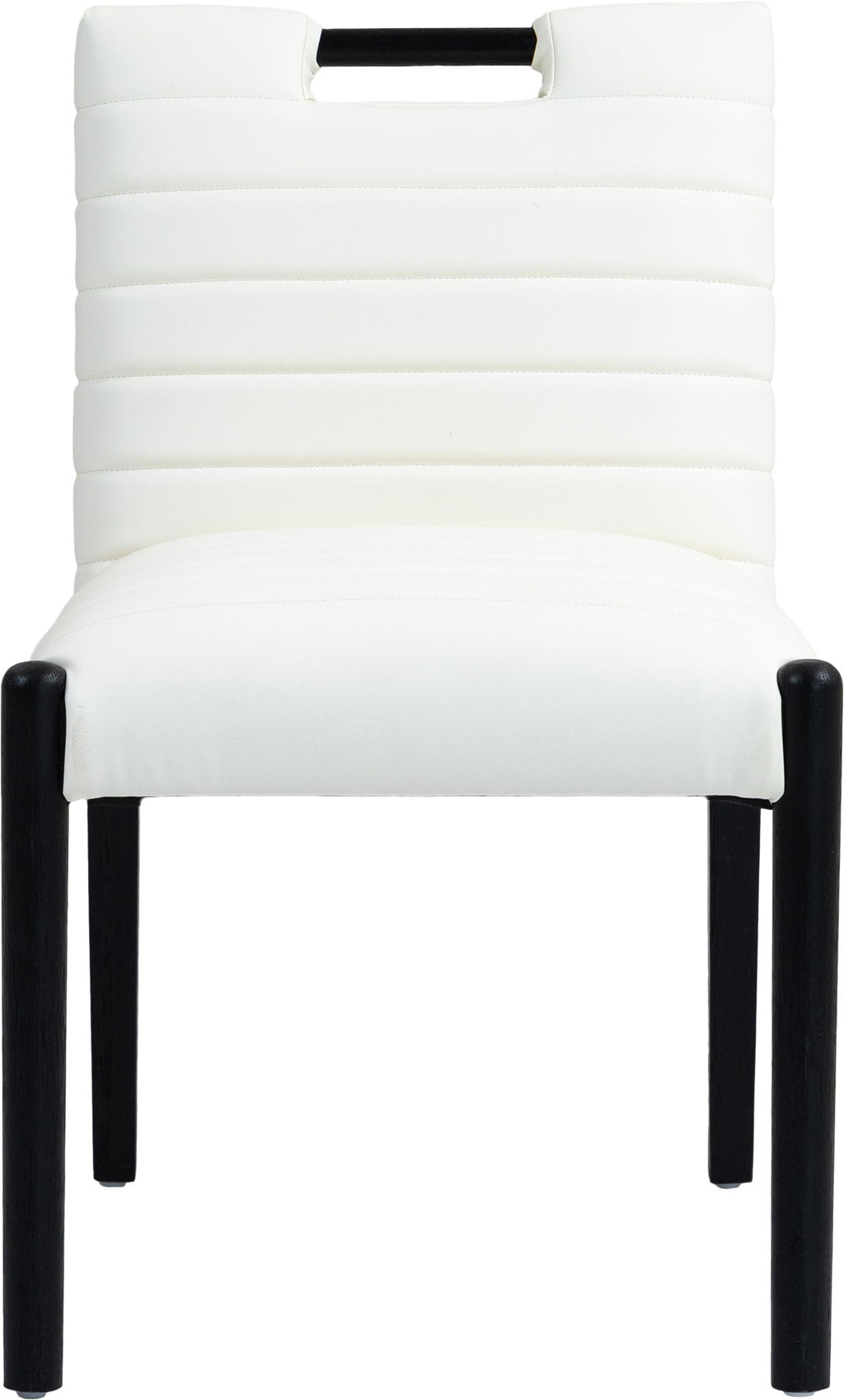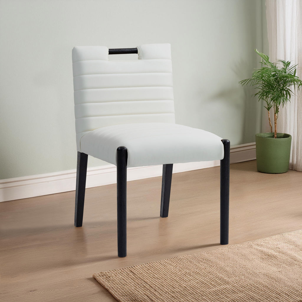A perfect fusion of modern elegance and eco-friendly luxury is the Aimee vegan leather dining side chair. Upholstered in sleek vegan leather, this chair offers a chic, contemporary look while maintaining a commitment to sustainable living. The padded, quilted design featuring solid black wood legs creates a stunning contrast between its soft upholstery and minimalist frame.