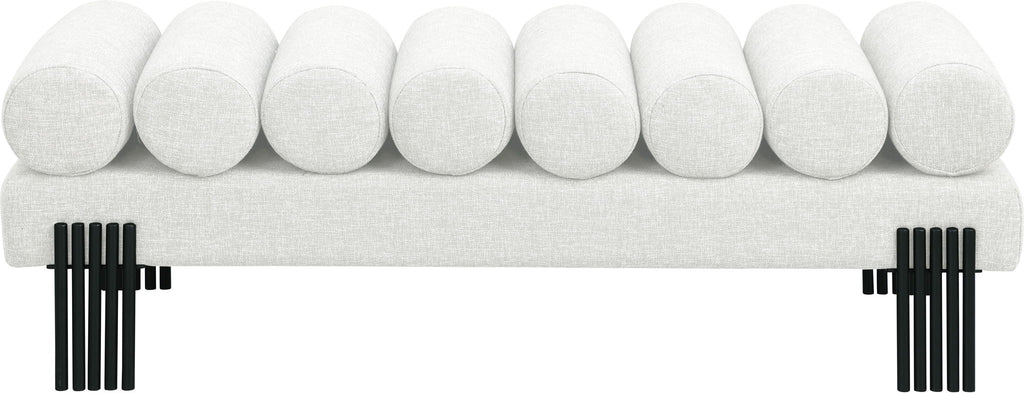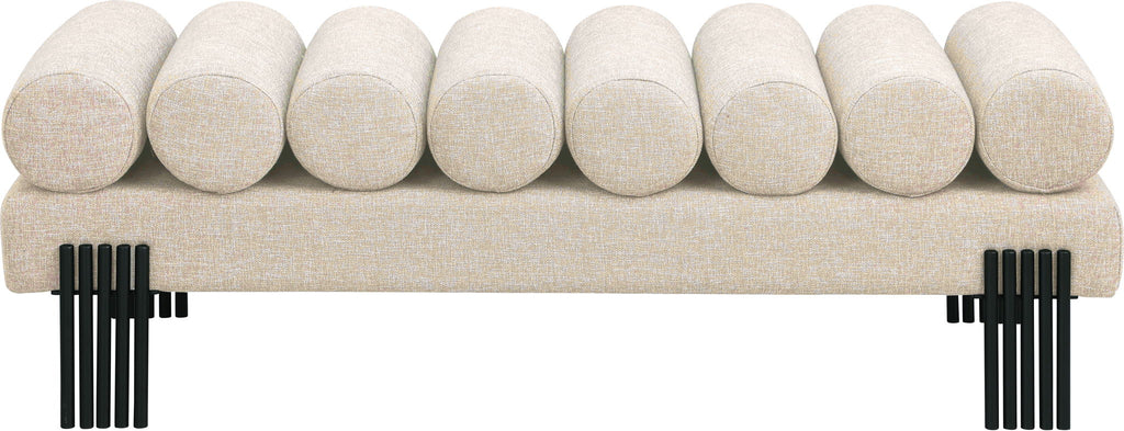 Revitalize your seating area with this stunning Akeela linen textured fabric bench featuring a rolled cushion top. Upholstered in rich linen textured fabric, this bench delivers both comfort and sophistication and features matte black metal legs to provide sturdy support while adding a modern touch to its art deco design. An ideal addition to an entryway, bedroom, or living room, the bench redefines your space with timeless charm.