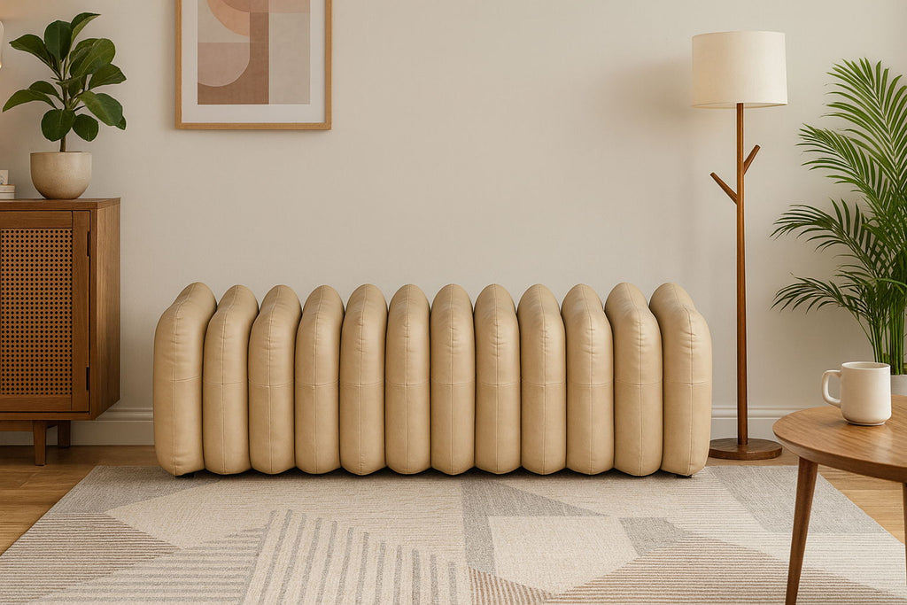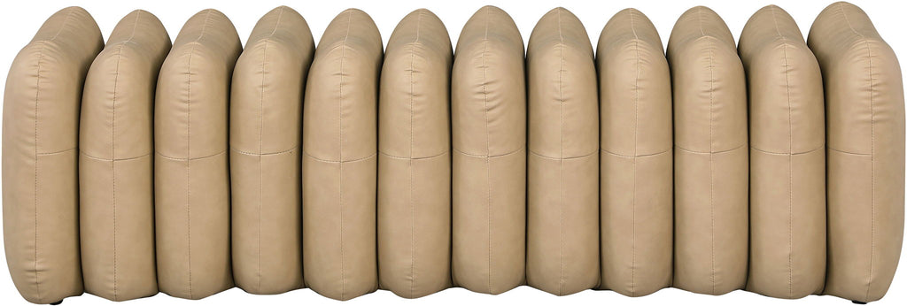 A bold and modern statement piece is the Atticus tan vegan leather upholstered bench that will elevate any room. Its unique, segmented design adds visual interest, while the plush tan vegan leather upholstery provides comfort and style. Perfectly versatile, this bench is an eye-catching addition to your home.