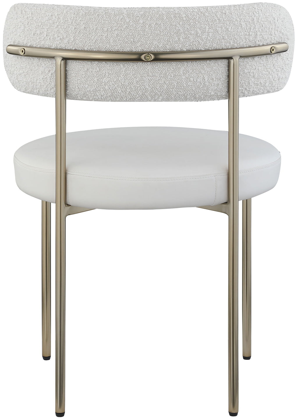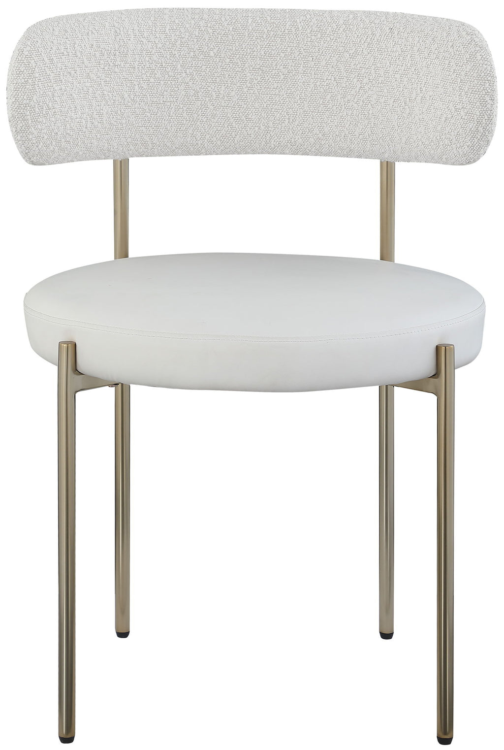 Give your dining room a modern boost with this Beacon vegan leather and boucle fabric dining chair. This pretty chair has the contemporary design elements you're looking for, from its curvy back to its thickly padded seat and brushed brass-finished metal frame. Vegan leather provides the look of the real thing without the maintenance requirements.