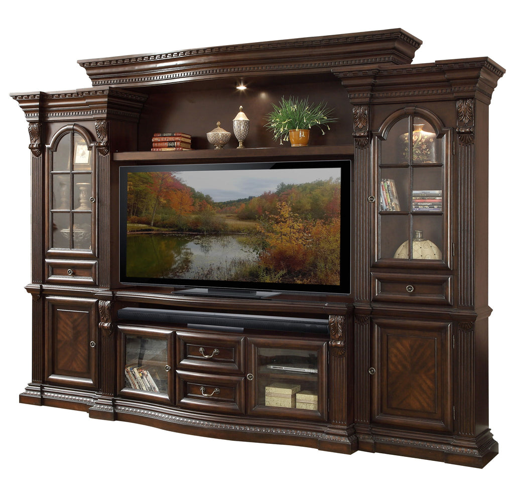 Traditional at heart, this four-piece Estate Wall from the Bella collection lets you create your home your way. A rich, hand-applied wood stain in Vintage Sienna highlights this media center's fluted columns, classic lines and carved detailing. Combining all the functionality of a modern entertainment console with beautiful glass-door cabinets and LED-lit display shelves, this estate wall has it all.