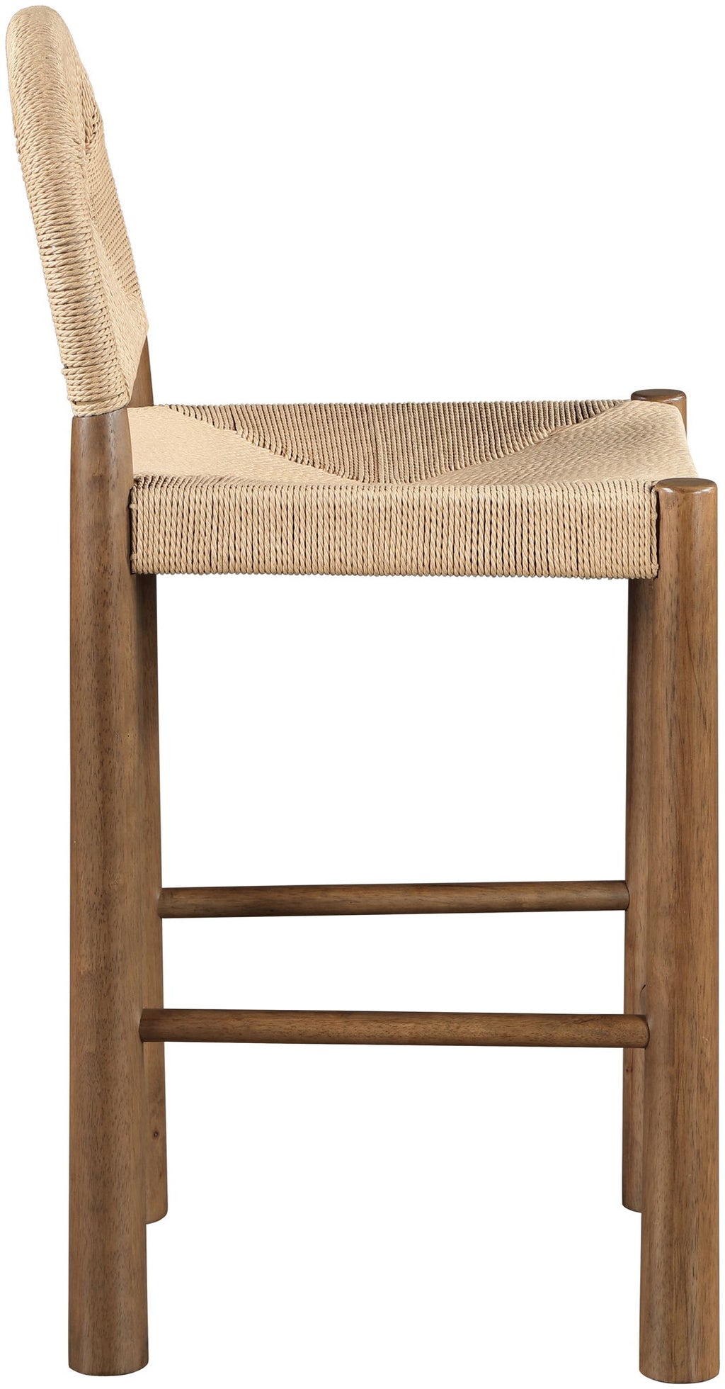 Organic textures and mid-century flair come together in the Bohemia counter stool, featuring a woven seagrass cord seat and back in warm, light brown. Bold, solid wood legs with a rich walnut finish ground the design, adding depth and dimension. From cozy nooks to chic dining areas, this stool effortlessly blends natural style with modern sophistication.