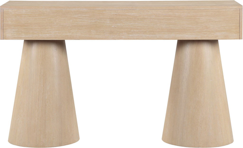 Bold and sculptural, the Bracciano oak veneer console table commands attention with its dramatic silhouette and rich finish. Intricate white grooves highlight the depth of its oak veneer, adding texture and dimension to its Art Deco-inspired design. Whether styled in an entryway or as a statement piece in a living space, this table transforms any setting with artistic flair.