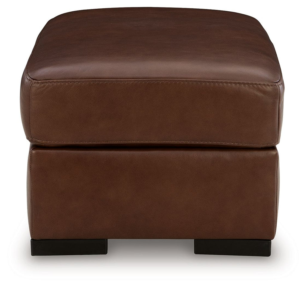 Effortlessly stylish, indulgently comfortable. This ottoman encourages everyday relaxation with an invitingly plush, spacious cushion. It embodies affordable luxury, pairing the sleek appeal of top grain leather with expertly matched faux leather. Suiting spaces from casual to contemporary, the ottoman's universal appeal makes staging your space nearly effortless.