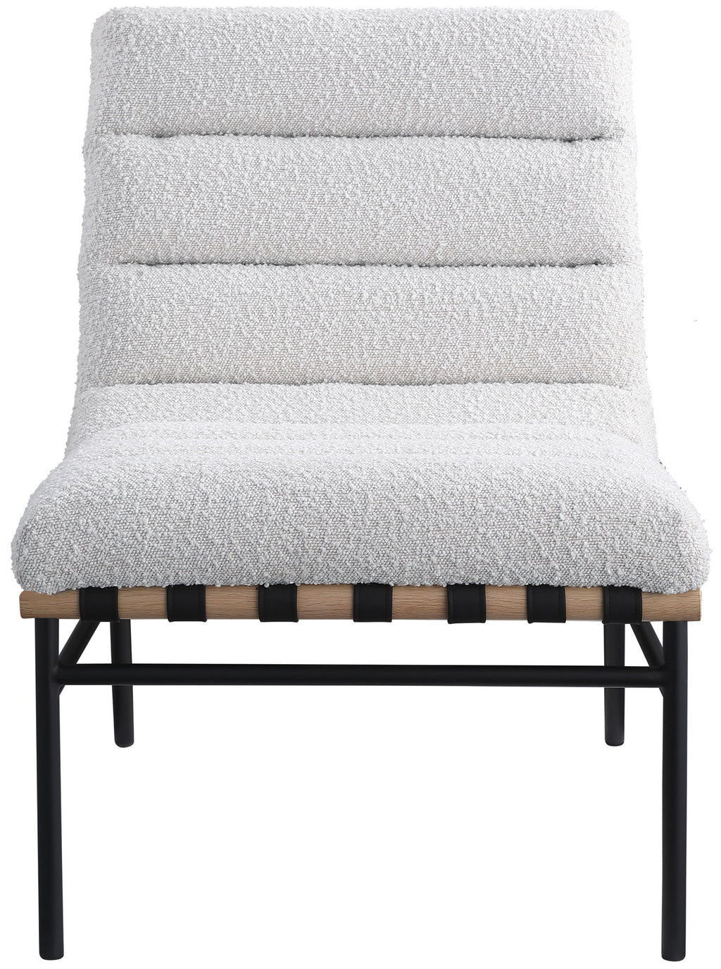 Keep it casual with this Burke accent chair. This eye-grabbing chair has an uber laid-back vibe with its armless design and slightly reclined back. Soft black vegan leather feels great against the skin and provides the look without the expense. An overstuffed, channel-tufted seat and back cushion make it super comfy and ready for evenings spent relaxing and taking it easy. An all-metal frame provides support for durable use, and an oak veneer metal dowel provides interesting contrast to draw the eye instantly from all angles.