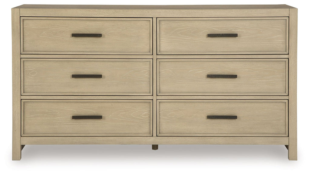 Satisfy your taste for calming, casually cool simplicity with this dresser. More than easy on the eyes, its finish with warm undertones is highlighted with a glaze to enhance the wood grain texture. Smooth-gliding storage drawers are accented with stylish metal bar pulls in a contrasting blackened steel finish. It's time to create the understated, relaxed look you want to wake up to every morning.