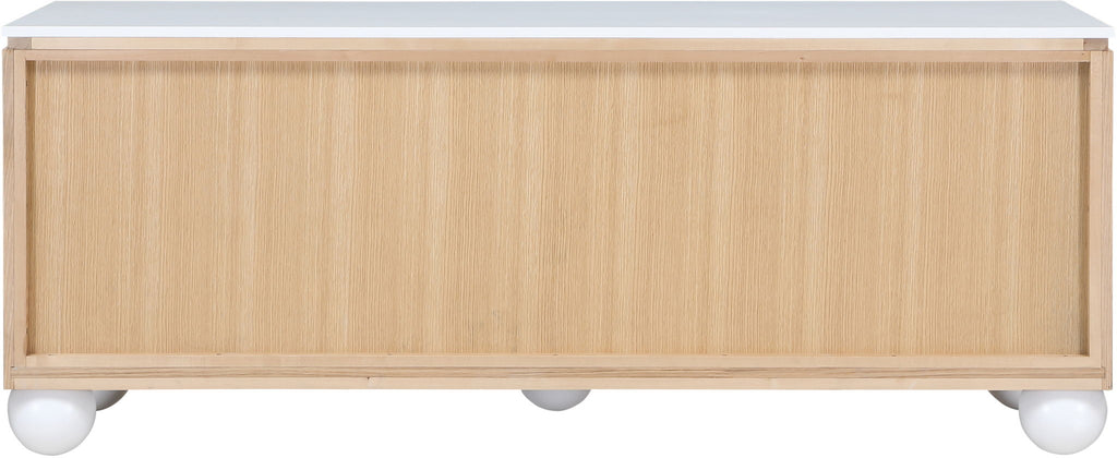 Transform your dining space into a haven of modern elegance with the Cardiff Black Sideboard Buffet. Featuring a rich oak finish contrasted with white lacquer legs and a lacquer top, it creates a sleek and modern aesthetic. Crafted mostly from solid wood with oak veneer made from rubberwood, as well as some parts made from MDF plywood, it boasts natural wood grain variation for added charm. This versatile piece serves as an elegant storage solution and a stylish platform for decorations. With doors designed to conceal cutlery, dishes, napkins, and dining supplies, it ensures your dining area stays organized and clutter-free. Elevate your dining experience with this handsome sideboard buffet that meshes practicality and sophistication effortlessly.