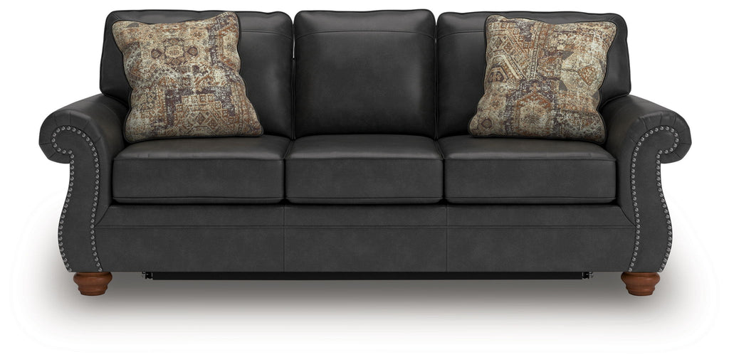 Everyone can have the best rest in the house with this queen sofa sleeper. Its nailhead trim puts the finishing touches on the traditional roll arms you love. The sofa's comfy, durable cushions—wrapped in a rustic yet sophisticated faux leather—keep you feeling relaxed, while its turned legs show that style and quality flow from top to bottom. A pull-out mattress made with quality memory foam comfortably accommodates overnight guests.