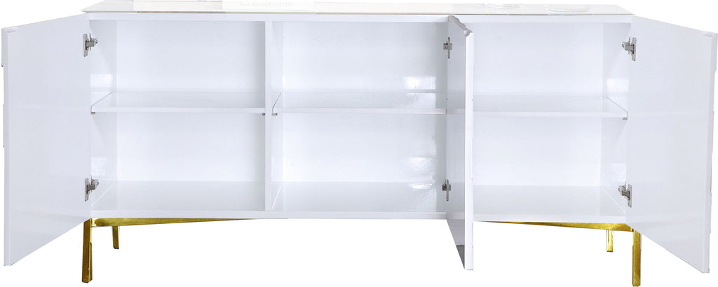 Organize the dining room with the help of this Collette Sideboard Buffet. This Meridian Furniture buffet has a rich stainless steel base that adds a gleaming, modish vibe and chevron lacquered exterior for a contemporary finish. Use the amply sized top for holding collectibles, photos, and other knickknacks.