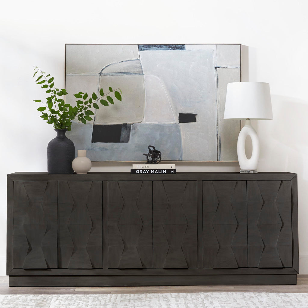 The Cortina console is a must-have for any unique home. It features a distinctive geometric design on the doors and a sturdy base for stability. This console has push-to-open doors for ease of use and is equipped with a hidden drawer and adjustable shelves, allowing for extra and always-needed storage.