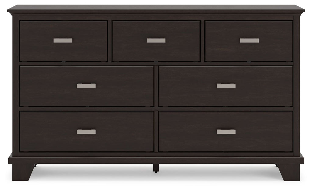 Feast your eyes on this richly versatile dresser. Its traditional-inspired dark brown finish effortlessly blends with contemporary bright nickel-tone pulls to create a stunning look that's not too stuffy or too trendy. Spacious drawers offer plenty of storage for your wardrobe and spare bed linens.
