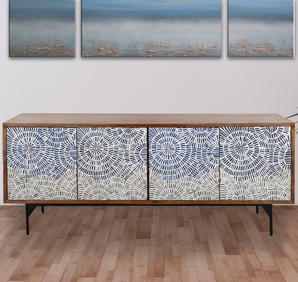 Our handcrafted, solid mango console featuring a stunning mosaic of bone inlay in circular patterns and the colors of sand and sea is a true work of art. This unique design is sure to be the focal point of any room in your home. Crafted from solid mango wood, this console boasts natural variations of color, wood grain and knots, making it a one-of-a-kind piece. Each console is handcrafted by artisans for and authentic, global-inspired character. with four doors that open to reveal two generous storage compartments and removable interior shelves, this console is not only beautiful but also functional. Its multifunctional design allows it to be used as a TV console, buffet, credenza or in any space you need stylish storage. The back panel features slots for ventilation and cord management, making it easy to keep your space clutter-free and organized. Each artisanal piece is unique, so colors and patterns vary slightly based on natural materials, adding to its charm and character. The concealed storage keeps clutter out of sight and the natural variations of color, wood grain and knots make it a unique piece of furniture.