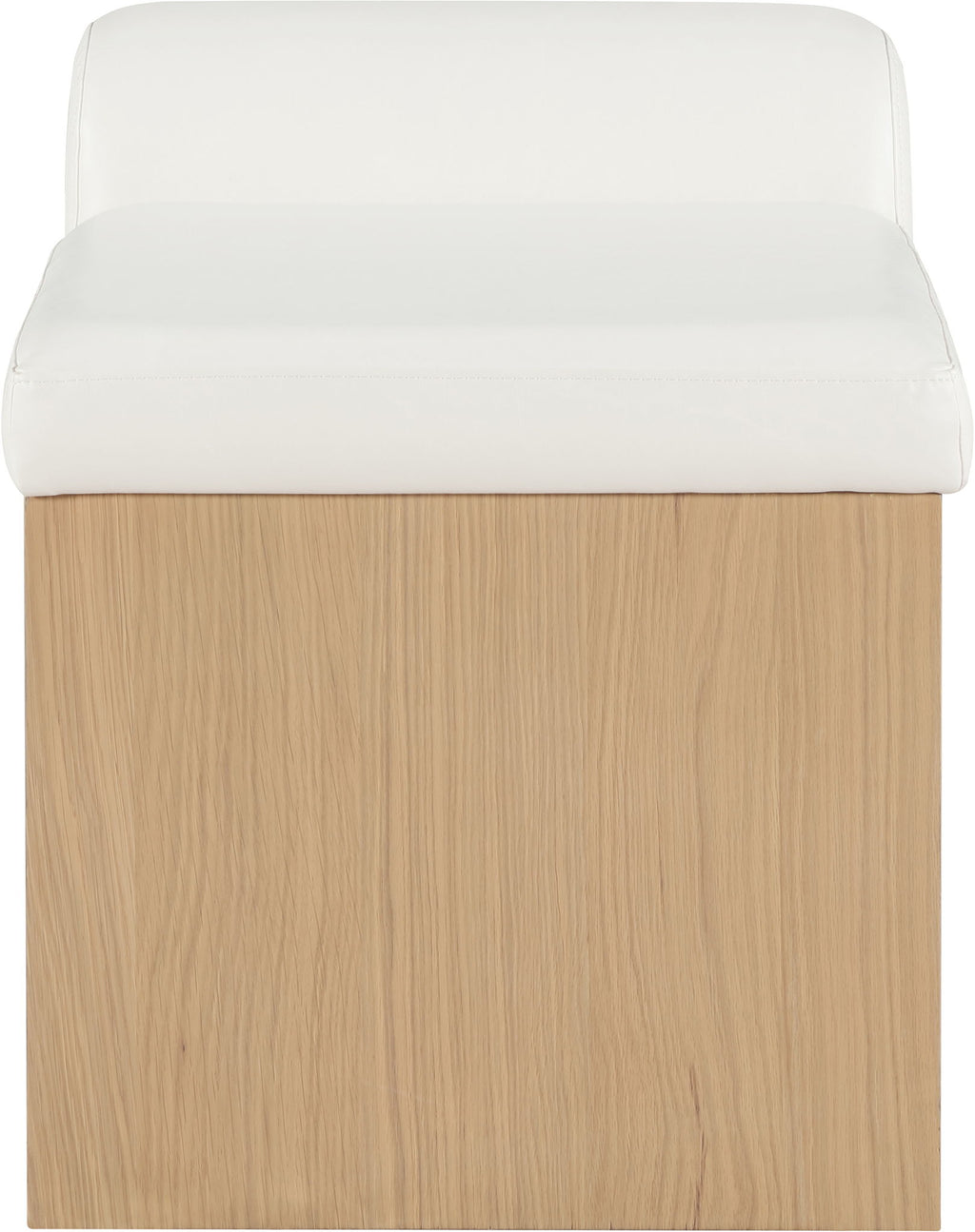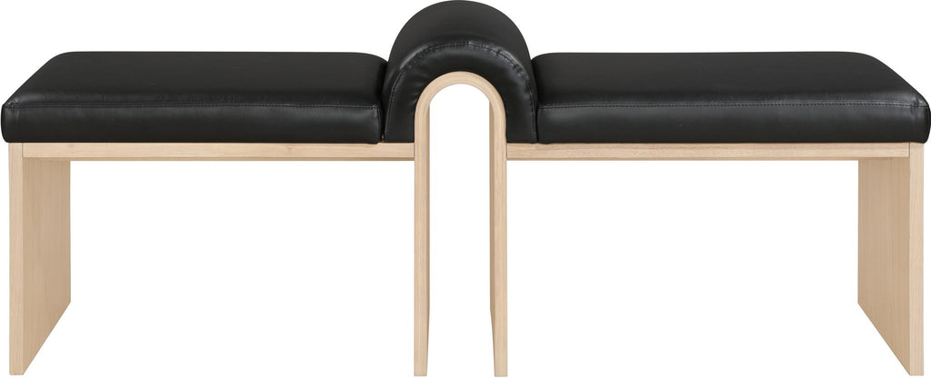 Seamlessly blending modern elegance with timeless craftsmanship, the Delphine vegan leather upholstered bench has a unique curvature to uplift any space. Upholstered in soft vegan leather, this bench offers a sleek, refined look complemented by its natural finish and oak veneer base. Crafted from a mix of solid wood and MDF, its contemporary design provides both durability and style, making it a versatile statement piece.