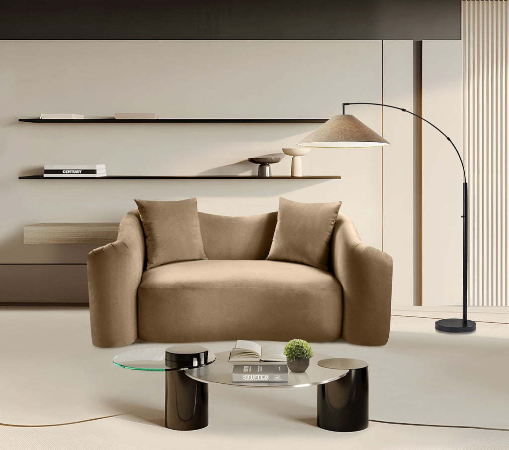 Indulge in pure luxury with the Destin velvet loveseat, featuring plush, oversized cushions and soft velvet upholstery for optimal comfort. Wrap yourself in comfort with a structural masterpiece offering a refreshing yet timeless aesthetic. The organic curves and plush velvet create a truly unique and eye-catching design.