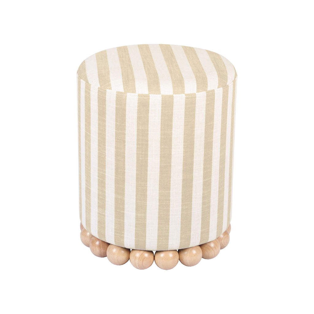 Meet the Dex Striped Linen Ottomans, a petite and playful addition to your space, combining fresh design with a tropical aesthetic. The solid wood spherical orbs on the base provide a unique aesthetic touch, ensuring a sturdy and stylish foundation. With washed linen-style cabana stripes, these ottomans bring a punch of personality to any space, offering additional seating or a stylish footrest. Available in Beige, Pastel Blue or Salmon Pink.