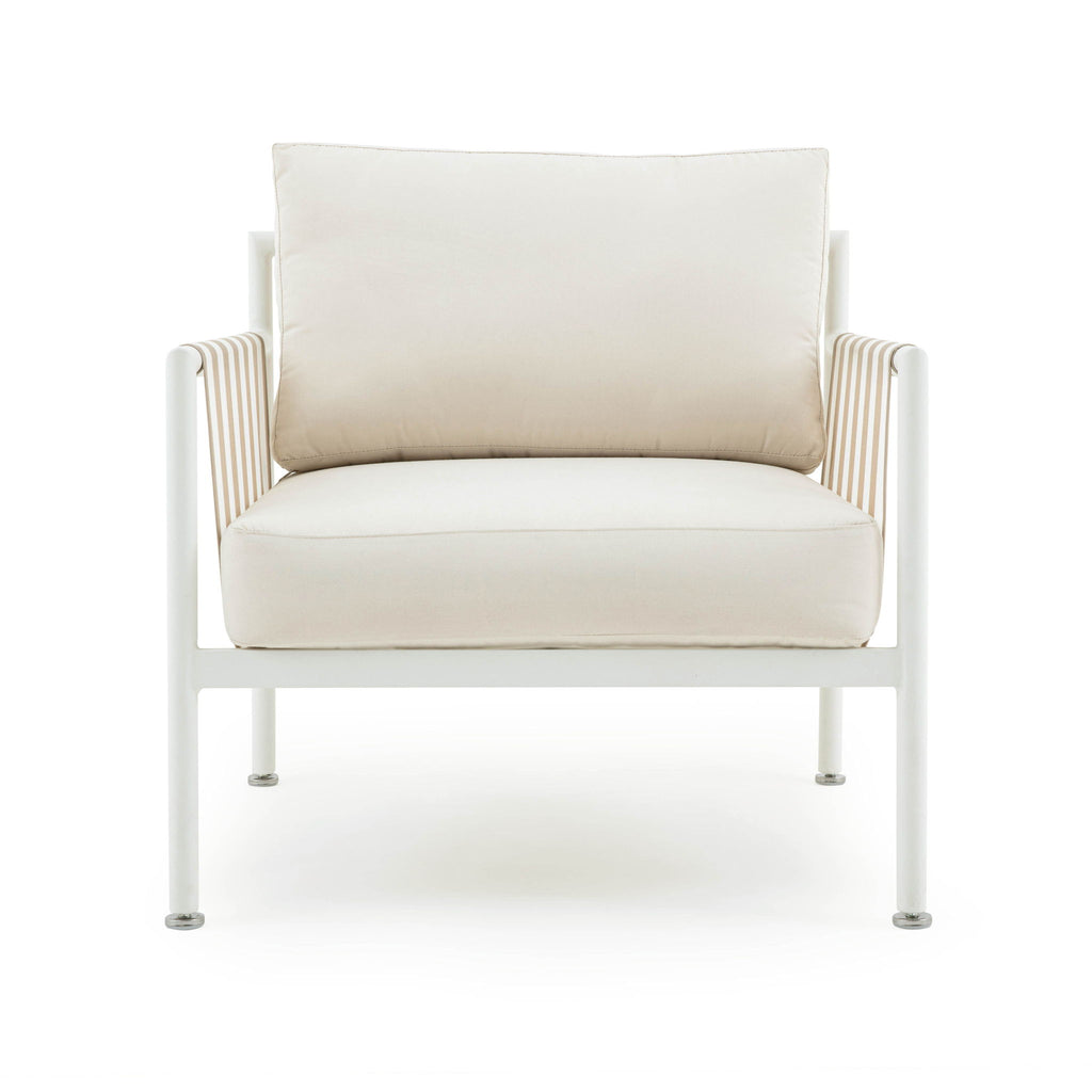 We're bringing the Riviera to you with the Dunes Cream Outdoor Collection, designed with an aluminum frame to prevent rust and ensure longevity, making it a durable addition to your backyard or patio. Crafted with outdoor-grade, UV-resistant polyester fabric and a powder-coated aluminum finish, this collection is built to withstand the elements while maintaining its chic appeal. The sectional features reversible cushions for easy stain management and high-density foam for indoor-level comfort, all while bringing the signature style of the French Riviera to your space with its stylish stripes. Plus, adjustable levelers offer the perfect solution for uneven outdoor surfaces, ensuring your sectional remains stable and wobble-free on any terrain.