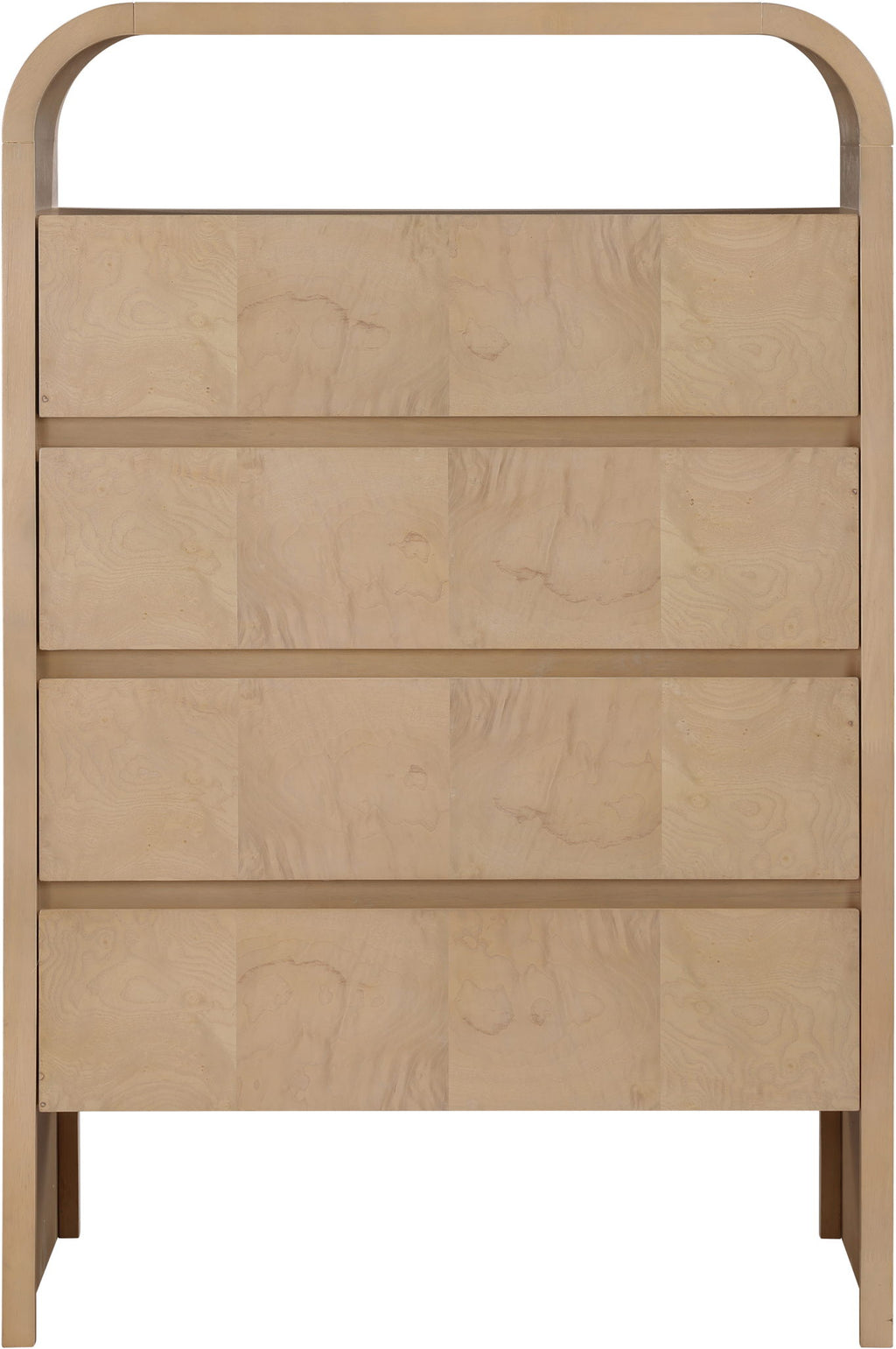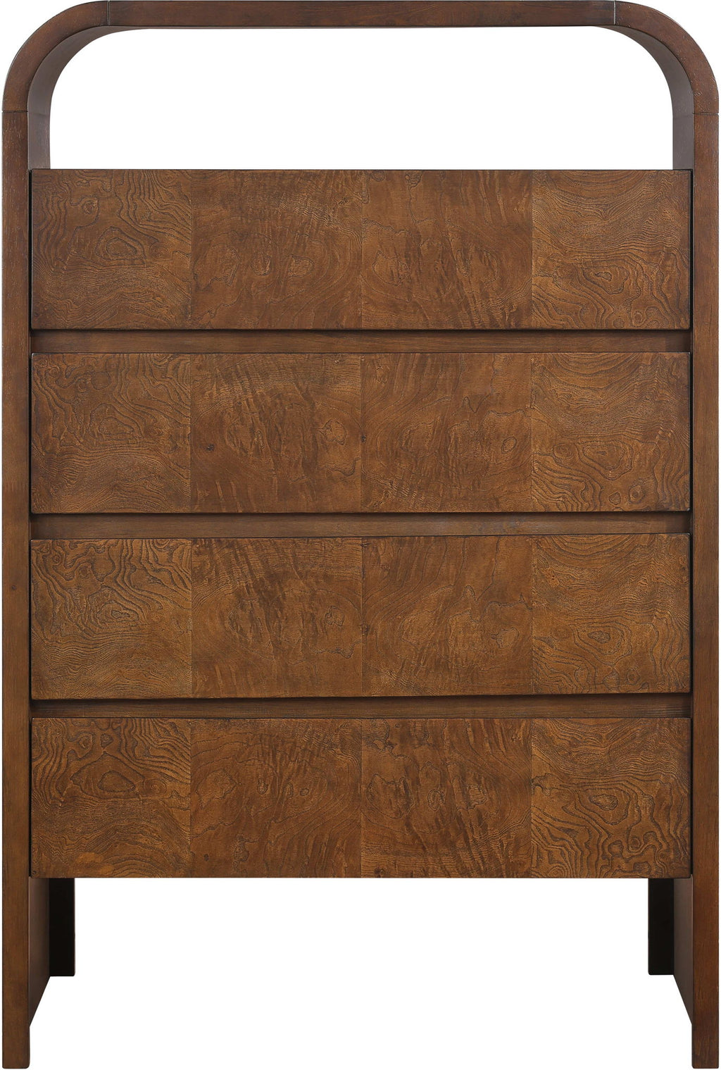 Arched edges, bold geometry, and rich burl wood grain give the brown Giada chest its art deco edge. Layers of oak and ash veneer create a striking visual texture that turns storage into a statement. Built from a mix of solid wood and MDF, it delivers durability wrapped in undeniable style.