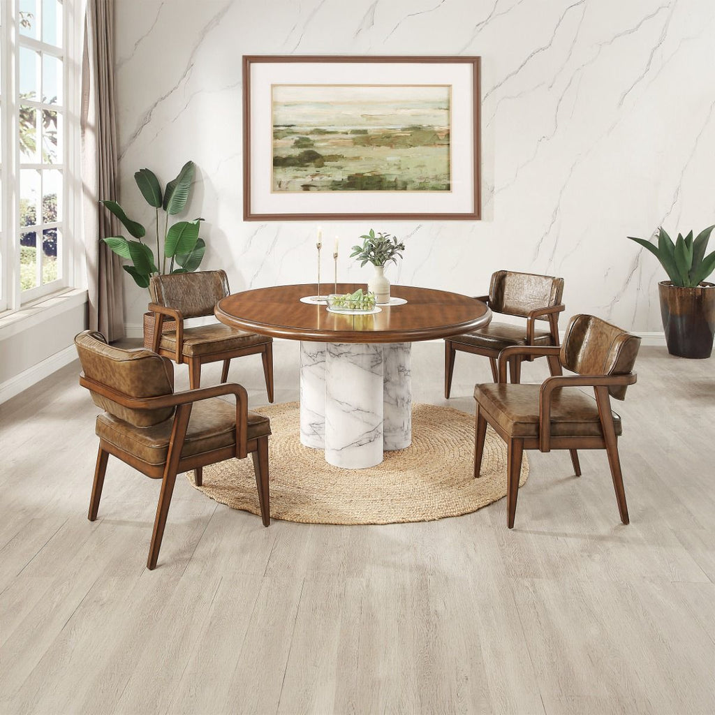 Striking and sophisticated, the Harvey Dining Collection is designed to be the centerpiece of your space. The round dining table features a rich brown wood top accented with three circular marble inlays at the center; an artful detail that adds contrast and refined texture. Anchoring the design is a bold cylinder marble base, creating a sculptural foundation with modern appeal. Paired with the table, the arm chairs are upholstered in smooth synthetic leather and finished in warm brown tones. Gently curved armrests and sturdy wooden legs offer both comfort and tailored style, making every seat feel inviting. Blending natural materials with contemporary form, the Harvey Collection delivers elevated dining with a statement-making edge.