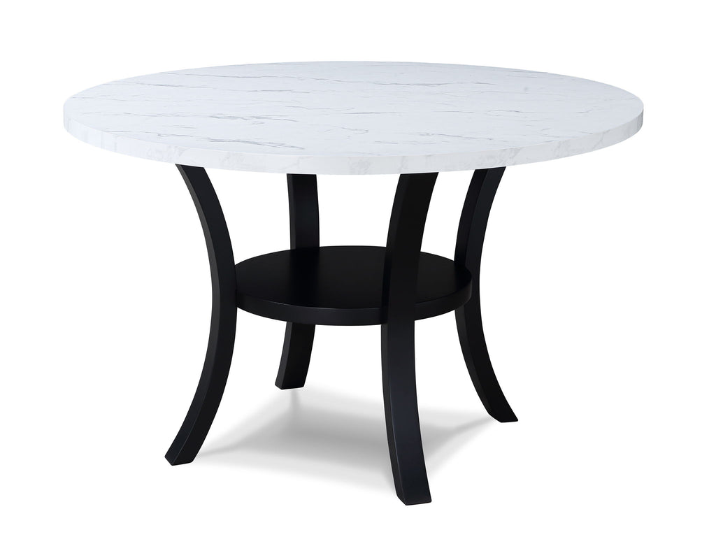 This dining group is the perfect blend of modern elegance and functionality. The sleek round tabletop with a marble-like finish offers a chic and refined aesthetic, while the bold black legs provide a striking contrast, adding visual interest to your dining area. The padded upholstered chairs, designed in a soft and neutral tone, deliver both comfort and style, making every meal a relaxed and enjoyable experience. With its clean lines and contemporary flair, this set is ideal for small spaces or casual dining environments, bringing sophistication and practicality to your home.