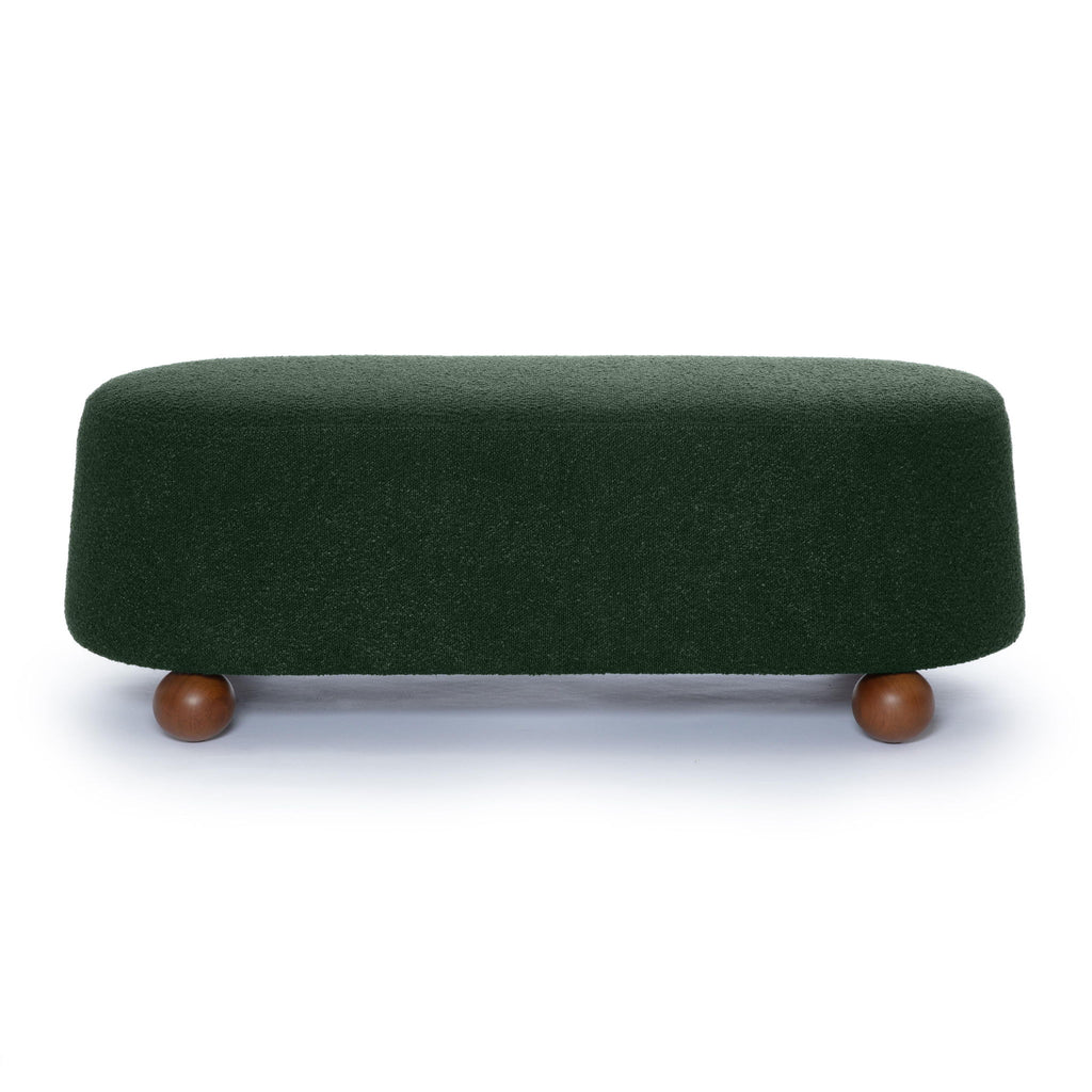 Add a playful charm to your space with the Jaine Stool, boasting a slightly conical shape that catches the eye. Its spherical solid wood legs provide a sturdy base, while the nubby boucle (available in chocolate brown, cream, or forest green) or loose faux mohair (available in forest green and stone grey) upholsteries add a modern, textured touch. Not only is it on-trend with its color palette, but this ottoman also seamlessly blends contemporary style with a tactile experience, making it a must-have for any room. Also available in two size variations!