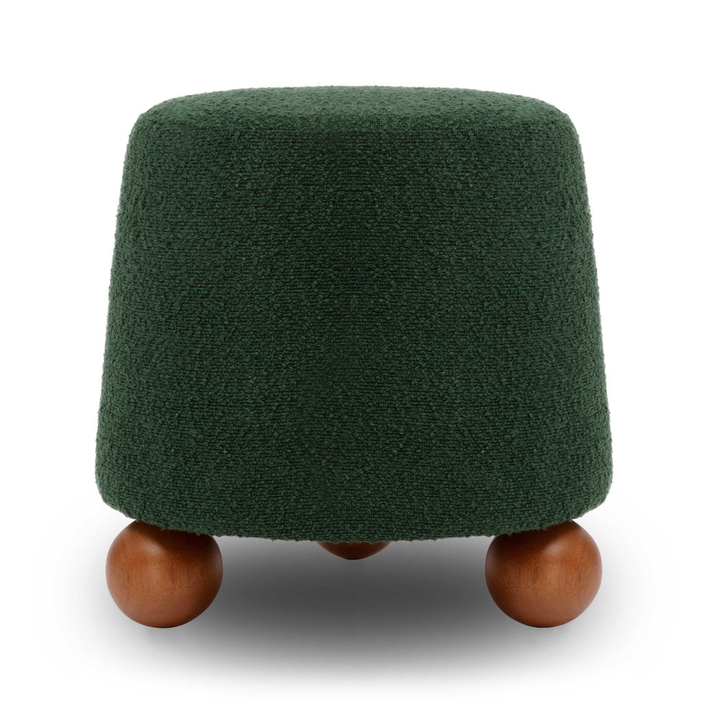 Add a playful charm to your space with the Jaine Boucle Stool, boasting a slightly conical shape that catches the eye. Its spherical solid wood legs provide a sturdy base, while the nubby boucle upholstery adds a modern, textured touch. Not only is it on-trend with its color palette, but this ottoman also seamlessly blends contemporary style with a tactile experience, making it a must-have for any room.