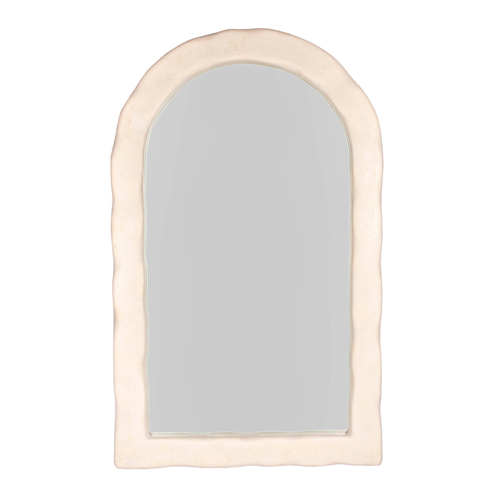 Embrace the wabi sabi trend with the Kaia Cream Textured Floor Mirror. Crafted with organic bumpy texture and a beautiful sculptural arch, this mirror brings a touch of natural beauty and artistic appeal to your space. Standing impressively at 79"H, this floor mirror becomes a captivating centerpiece. Expertly made with fiberglass, it combines durability with stunning design, making it a functional and stylish addition to your home.