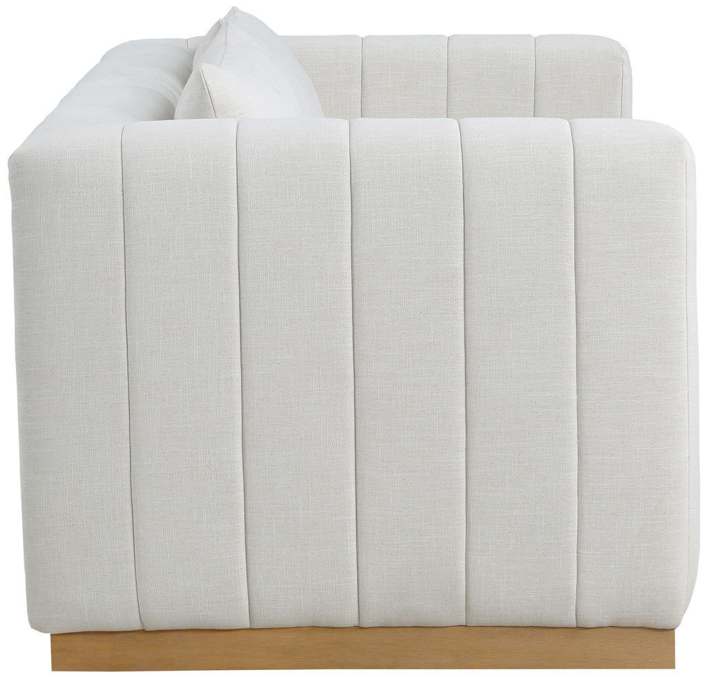 Succumb to the welcoming comfort of this Lucia textured linen fabric living room loveseat. This oversized loveseat offers you the room you need to cozy up with a book or a cup of hot tea. Its rich linen textured fabric feels soft and inviting against the skin, and the plump back cushion adds to its relaxing feel against your body. Deep channel tufting keeps the loveseat's fill intact, and it rests on a contrasting black solid wood base for resilient support.
