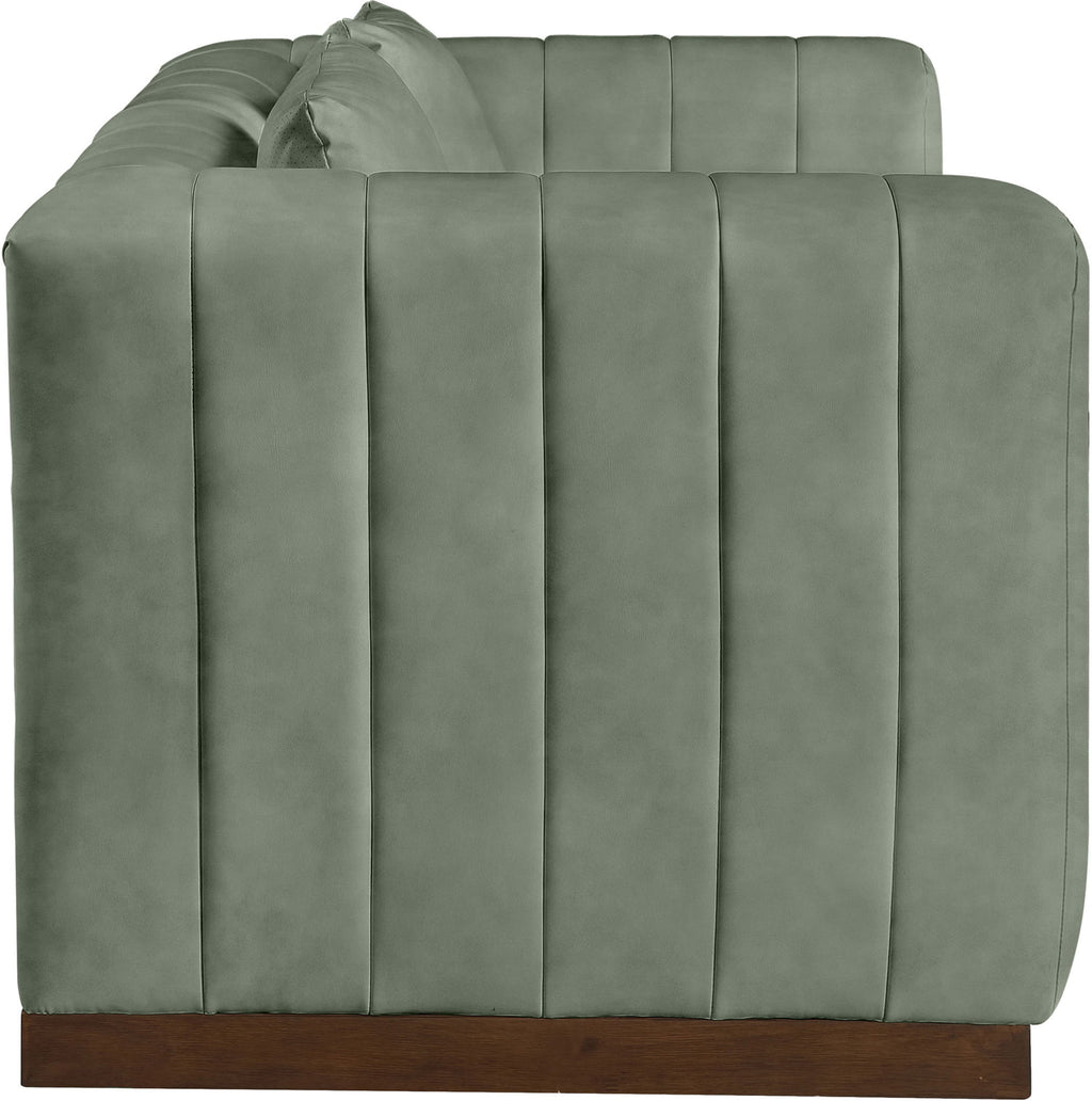 A minimalist masterpiece, the Mallina vegan leather loveseat combines form and function for a modern and stylish look. Its classic design and rich leather upholstery make it a sophisticated statement piece that will never go out of style. The clean lines, paired with a brown walnut finished base, create a sophisticated and inviting atmosphere.