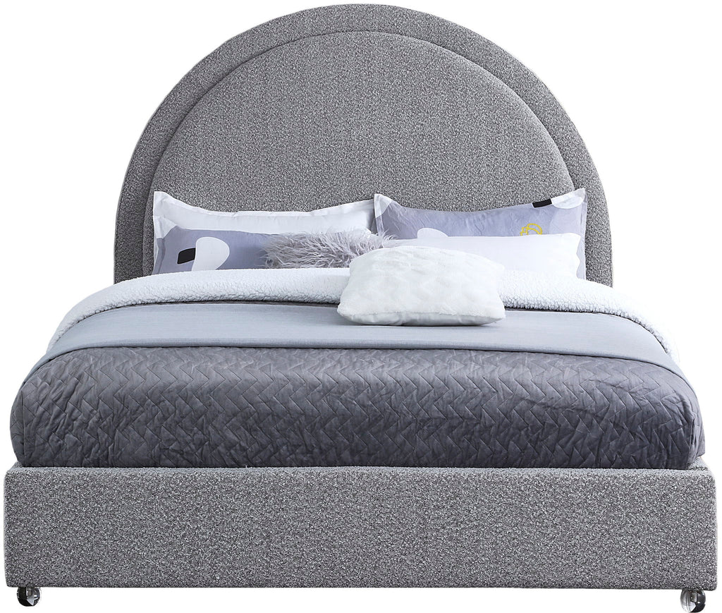 Get ready for compliments when you add this Milo boucle fabric bed to your space. It's upholstered head to foot in rich boucle fabric, so it's soft to the touch and regal to the eye. The star of the show is the bed's rounded headboard, which stretches out tall above you for a look that oozes regality and sophisticated charm. Acrylic legs give the bed a somewhat modern finish.