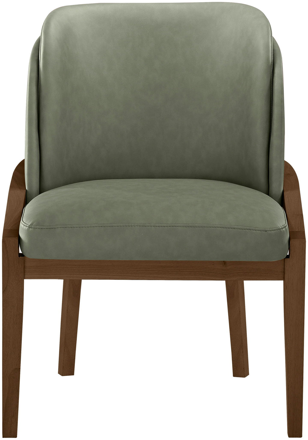 Warm and inviting, the Navo green vegan leather upholstered dining chair blends Art Deco elegance with everyday comfort. Its smooth vegan leather seat is paired with a solid wood frame in a rich brown walnut finish for timeless appeal. With its sculpted back and tailored lines, it adds sophistication to any dining setting.