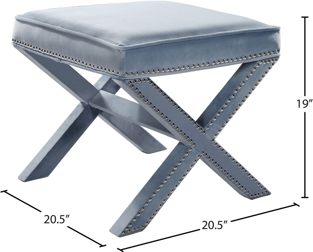 You'll be sitting pretty on this Nixon velvet ottoman/bench. This beautiful piece has a stunning look with its velvet upholstery and nail head trim that gives your room a decidedly contemporary vibe. The X-shaped legs are sturdy and stout, making it a beautifully durable addition to your space. The ottoman's large top accommodates your feet while you relax and unwind with a good book, or pull it out on game night for an extra seat.