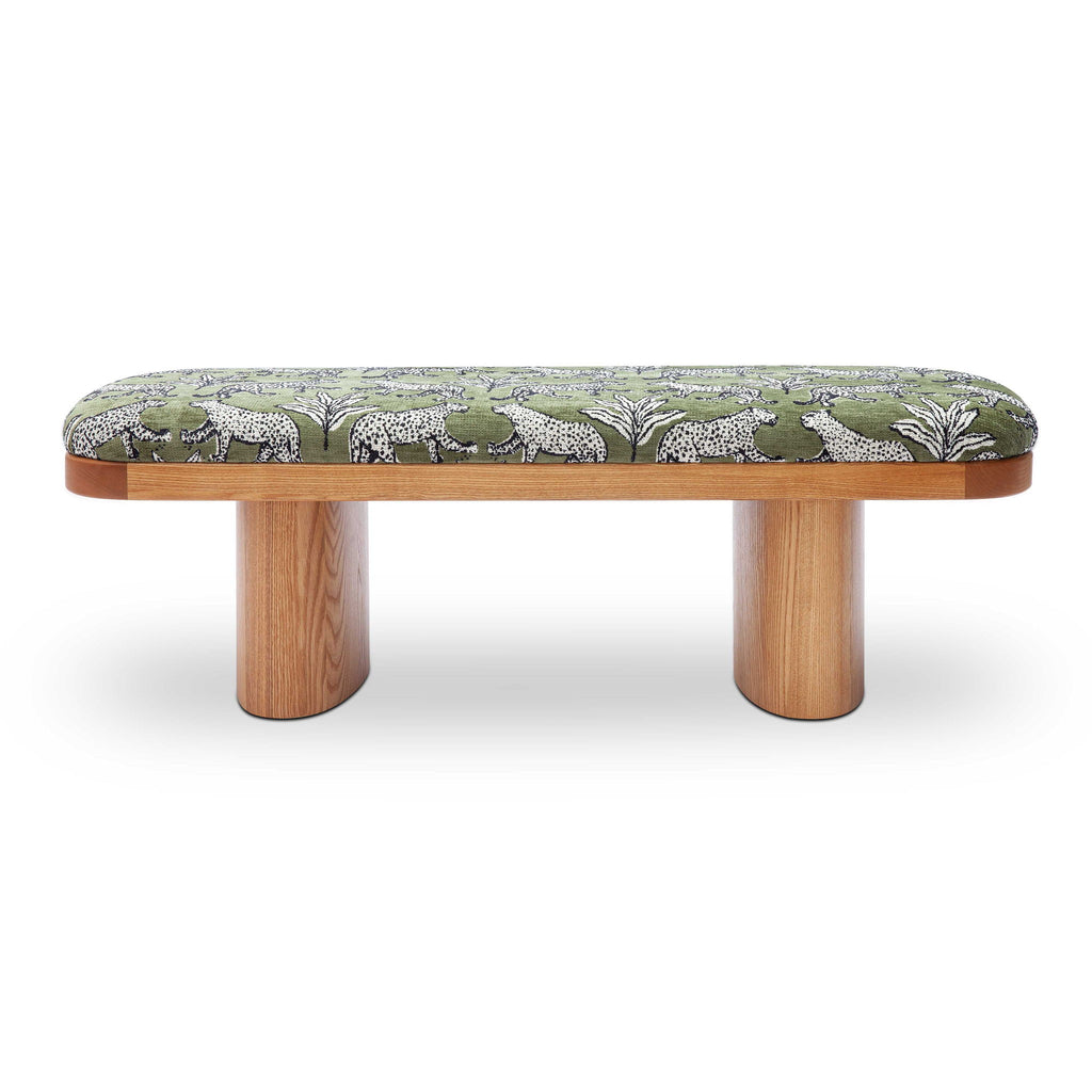 NEW! Our Ollie Bench is an inspired piece with Danish-leaning design. The perfect warm mid-tone wood is sculptural and substantial topped with luxurious leopard jacquard print fabric. Place Ollie anywhere in your home to complete a space with thoughtful intentionality.