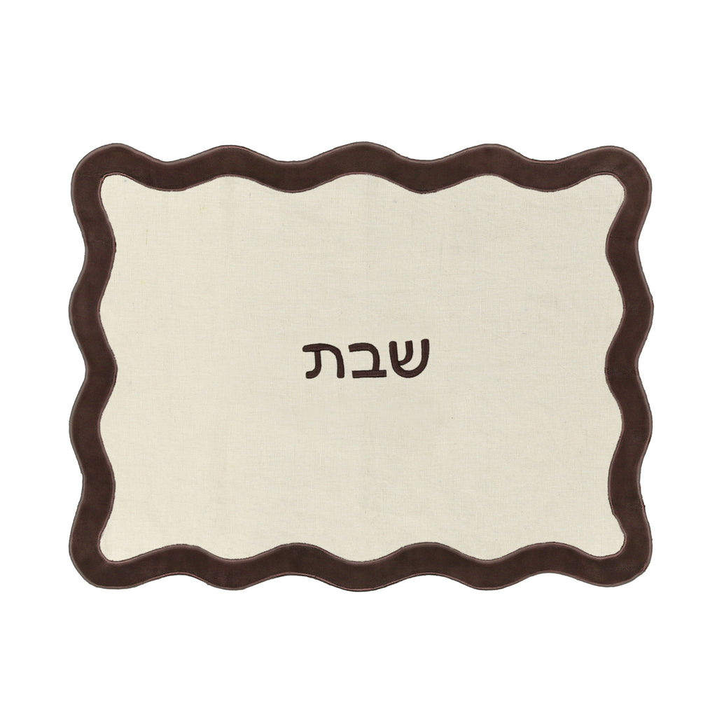 Enhance your Shabbat table setting with the TOV Wavy Challah Cover! This isn't just any challah cover; it is crafted from a stylish linen-cotton blend and features a durable, wipeable vegan leather backing. It skillfully combines contemporary style with timeless tradition. Available in several stylish color options, the trendy scalloped design and modern "Shabbat" lettering make it a perfect addition to any modern Jewish home.
