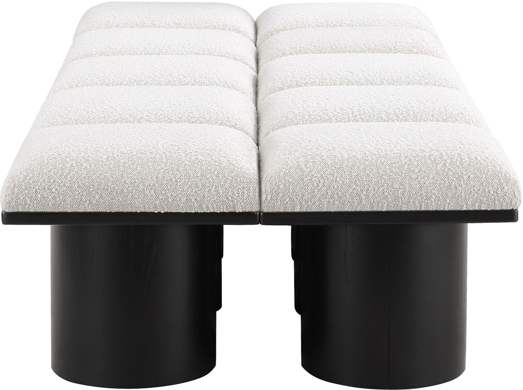 Bring valuable seating and remarkable style to your space with this Pavilion Boucle Fabric Bench, an exquisite balance of style and usability for the entryway, bedroom, and beyond. Crafted from oak veneer with a black finish, this bench has a 4-inch-thick seat cushion that's channel-tufted for a touch of luxury. The bench's columnar bases add a dash of Art Deco design, making it a captivating focal point in any room.