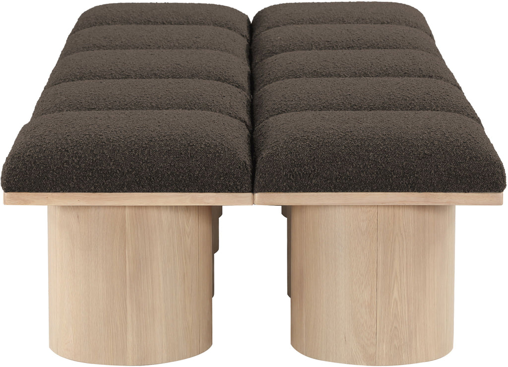 Bring valuable seating and remarkable style to your space with this Pavilion boucle fabric bench, an exquisite balance of style and usability for the entryway, bedroom, and beyond. Crafted from oak veneer with a natural finish, this bench has a 4-inch-thick seat cushion that's channel-tufted for a touch of luxury. The bench's columnar bases add a dash of art deco design, making it a captivating focal point in any room.
