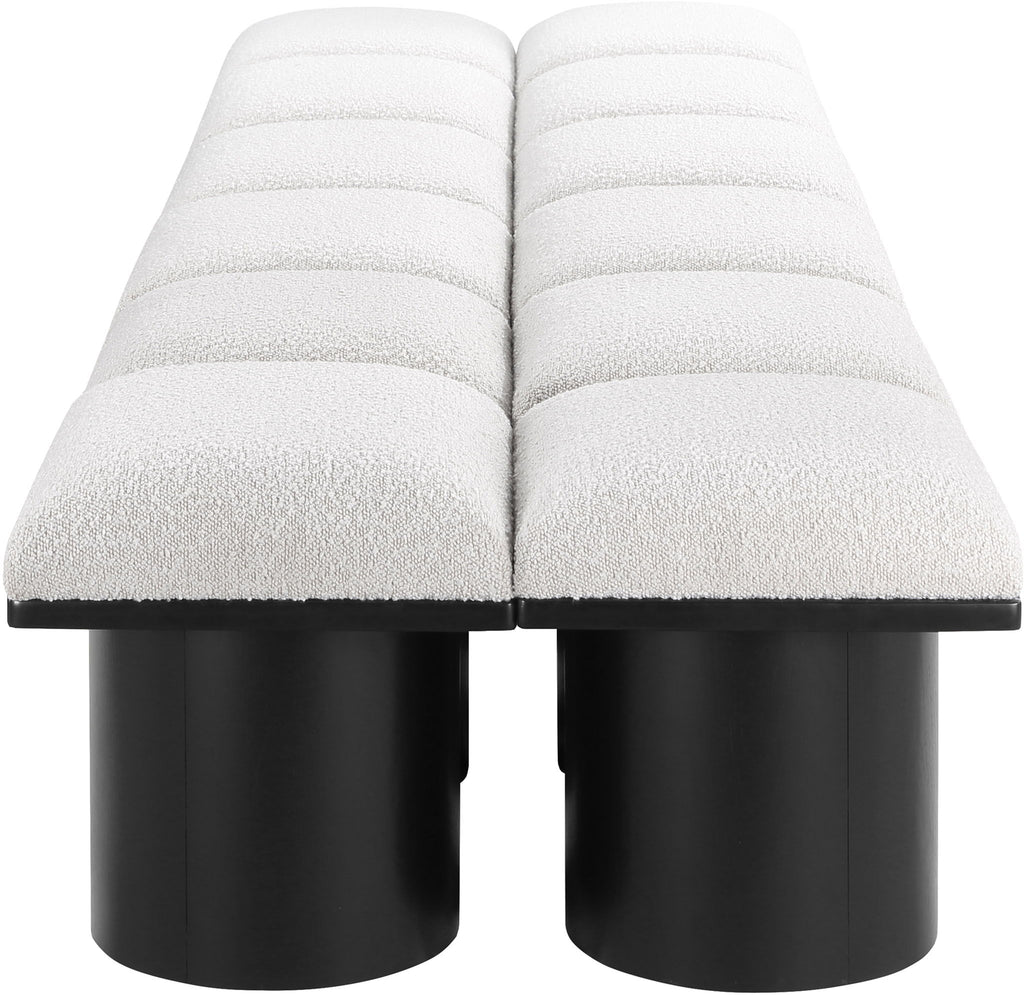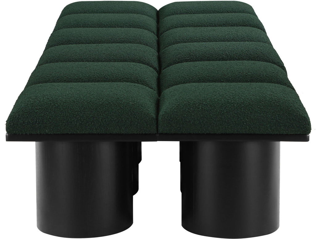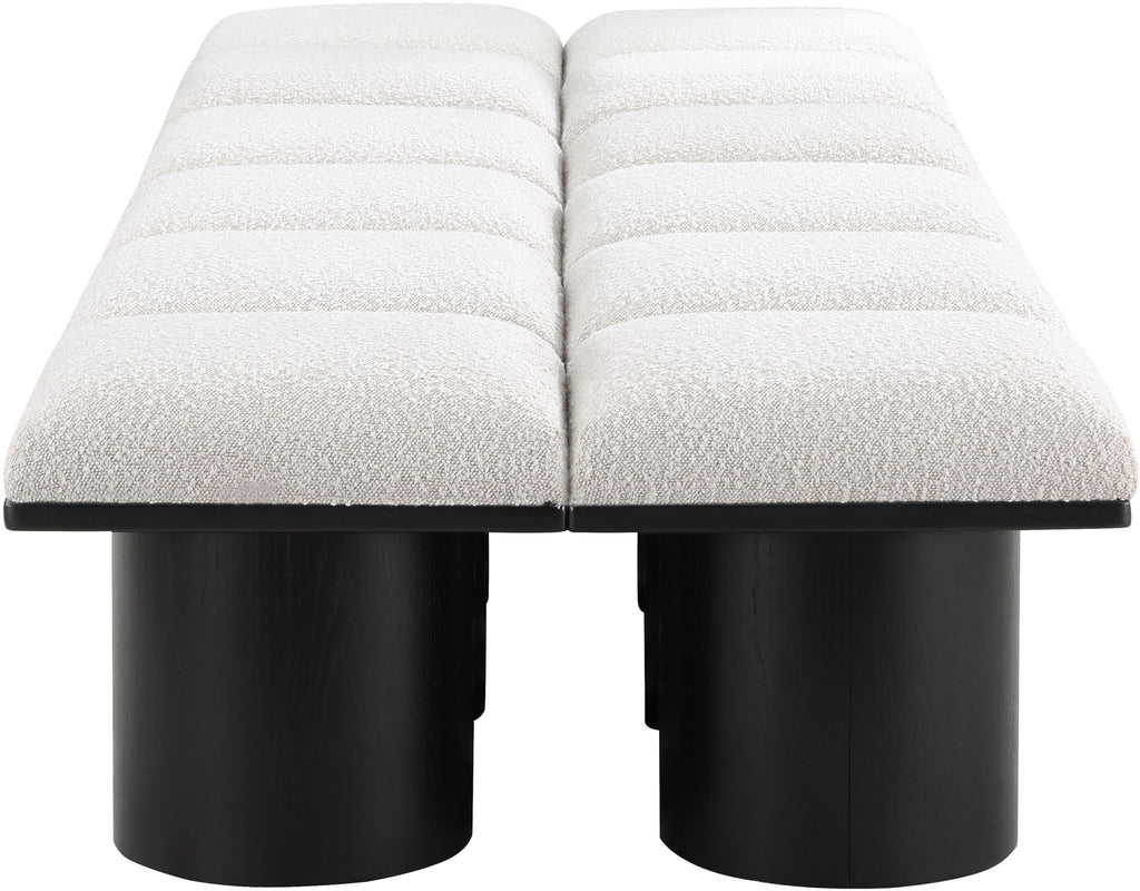 Bring valuable seating and remarkable style to your space with this Pavilion Boucle Fabric Bench, an exquisite balance of style and usability for the entryway, bedroom, and beyond. Crafted from oak veneer with a black finish, this bench has a 4-inch-thick seat cushion that's channel-tufted for a touch of luxury. The bench's columnar bases add a dash of Art Deco design, making it a captivating focal point in any room.