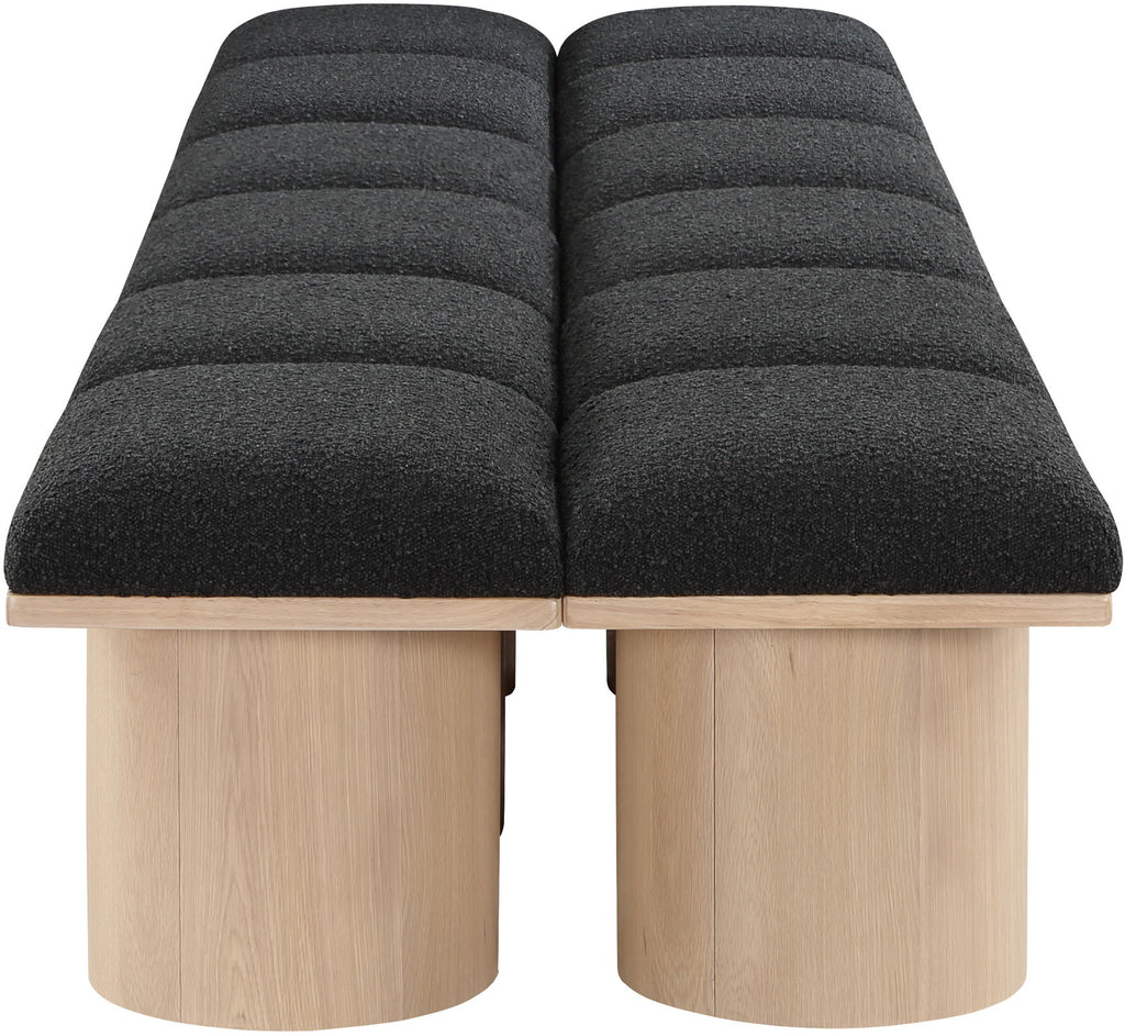 Bring valuable seating and remarkable style to your space with this Pavilion boucle fabric bench, an exquisite balance of style and usability for the entryway, bedroom, and beyond. Crafted from oak veneer with a natural finish, this bench has a 4-inch-thick seat cushion that's channel-tufted for a touch of luxury. The bench's columnar bases add a dash of art deco design, making it a captivating focal point in any room.