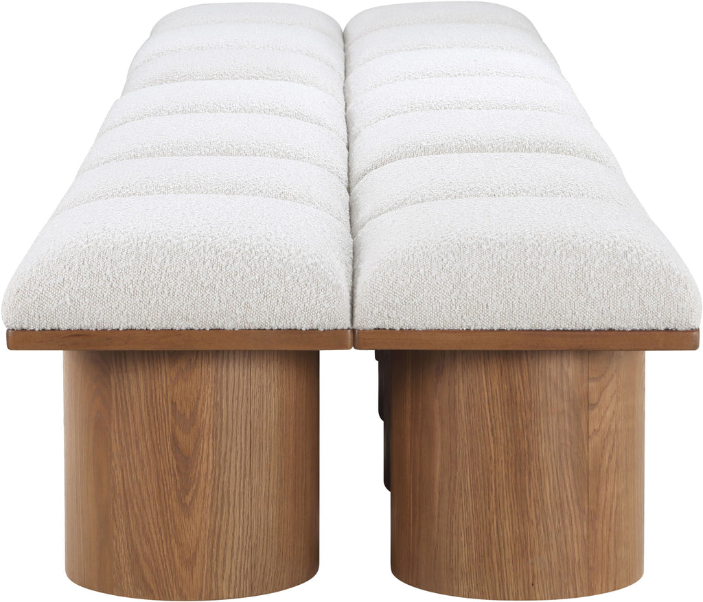 Bring valuable seating and remarkable style to your space with this Pavilion boucle fabric bench, an exquisite balance of style and usability for the entryway, bedroom, and beyond. Crafted from oak veneer with a walnut brown finish, this bench has a 4-inch-thick seat cushion that's channel-tufted for a touch of luxury. The bench's columnar bases add a dash of art deco design, making it a captivating focal point in any room.