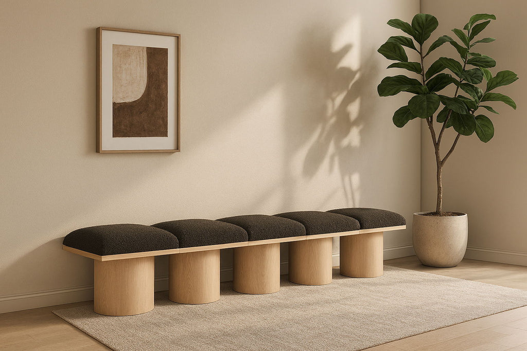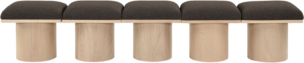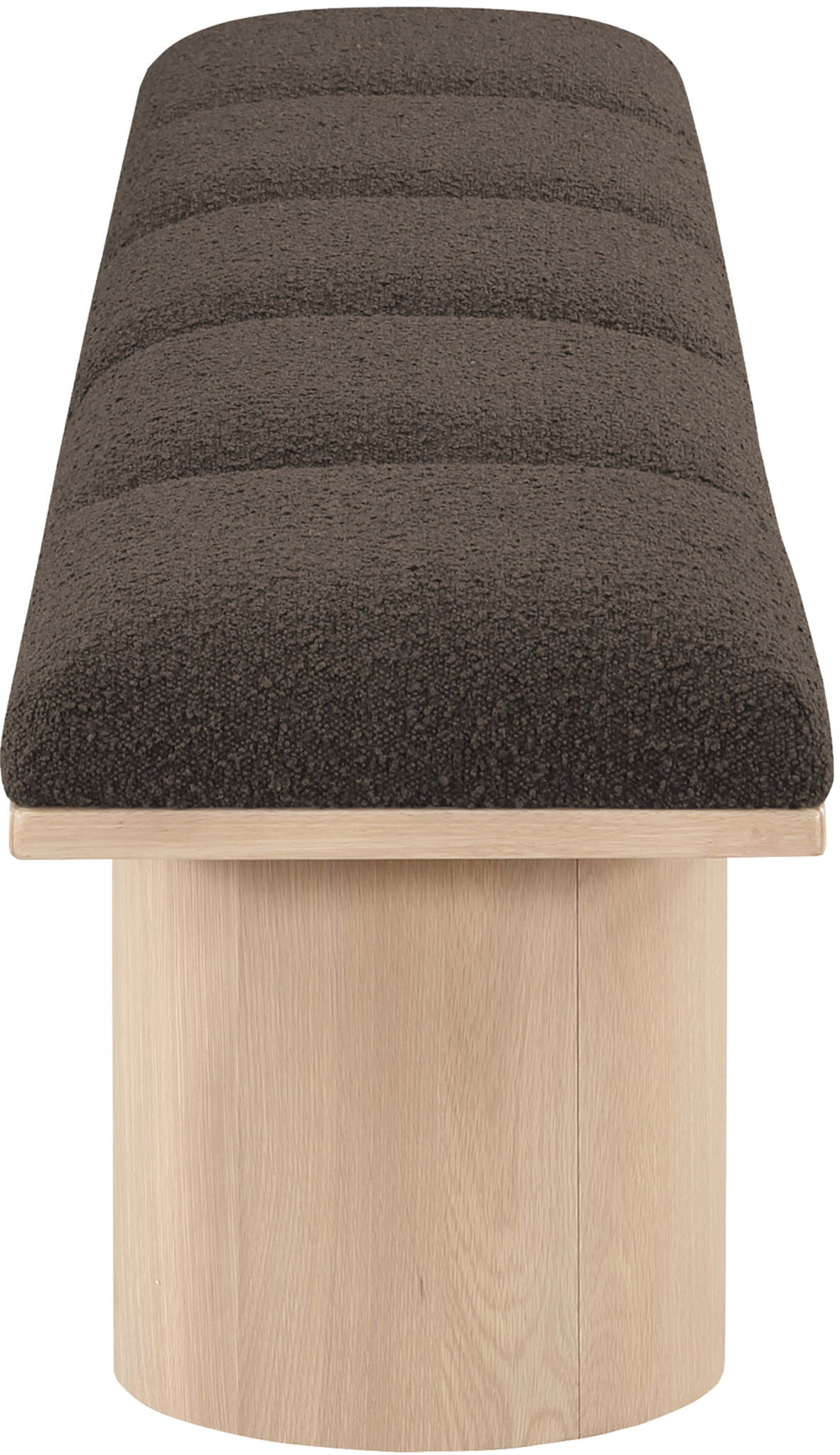 Bring valuable seating and remarkable style to your space with this Pavilion boucle fabric bench, an exquisite balance of style and usability for the entryway, bedroom, and beyond. Crafted from oak veneer with a natural finish, this bench has a 4-inch-thick seat cushion that's channel-tufted for a touch of luxury. The bench's columnar bases add a dash of art deco design, making it a captivating focal point in any room.