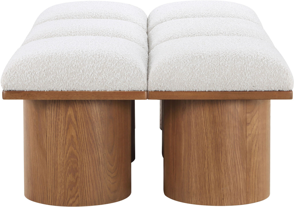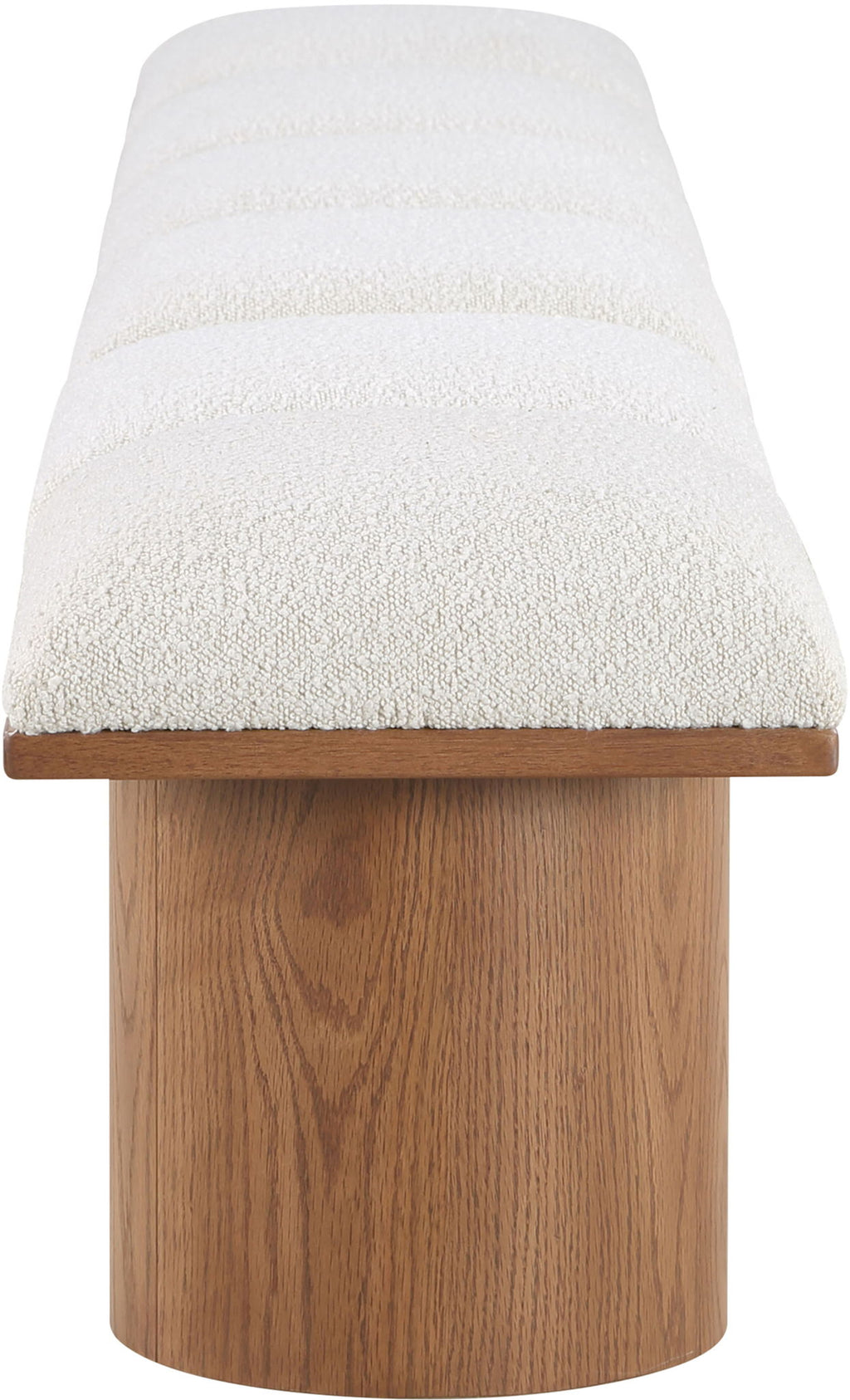 Bring valuable seating and remarkable style to your space with this Pavilion boucle fabric bench, an exquisite balance of style and usability for the entryway, bedroom, and beyond. Crafted from oak veneer with a walnut brown finish, this bench has a 4-inch-thick seat cushion that's channel-tufted for a touch of luxury. The bench's columnar bases add a dash of art deco design, making it a captivating focal point in any room.