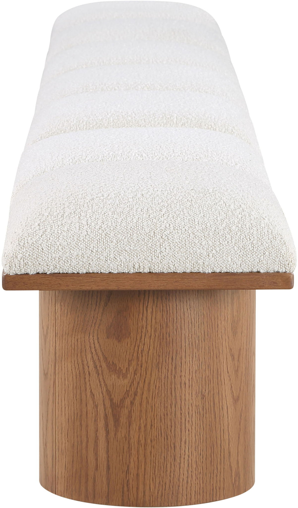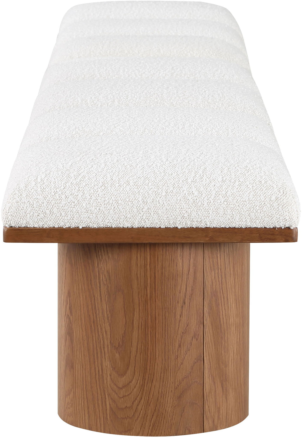 Bring valuable seating and remarkable style to your space with this Pavilion boucle fabric bench, an exquisite balance of style and usability for the entryway, bedroom, and beyond. Crafted from oak veneer with a walnut brown finish, this bench has a 4-inch-thick seat cushion that's channel-tufted for a touch of luxury. The bench's columnar bases add a dash of art deco design, making it a captivating focal point in any room.