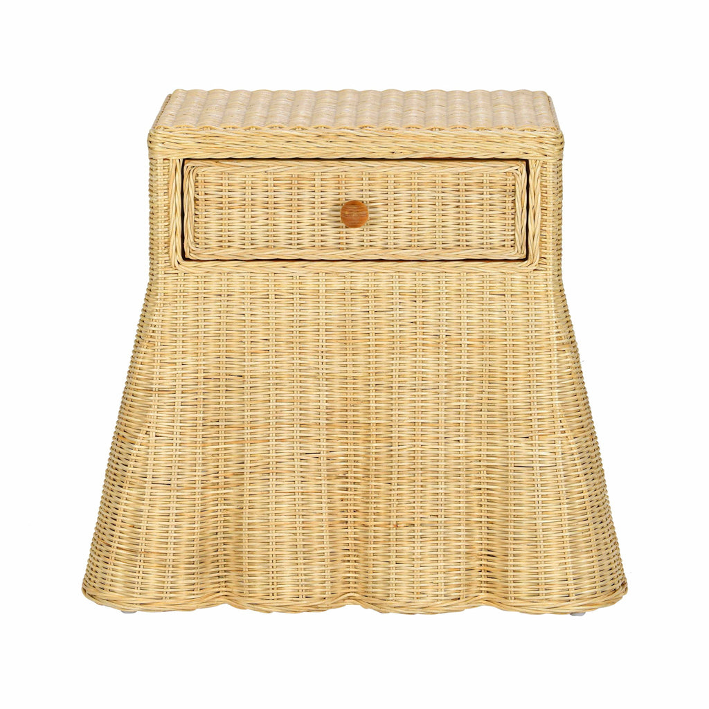The Pentra Nightstand charms with a handwoven rattan frame, solid wood knob, and a softly skirted base. With a felt-lined drawer and smooth glide rails, it's a dreamy blend of cottage-core whimsy and everyday function.