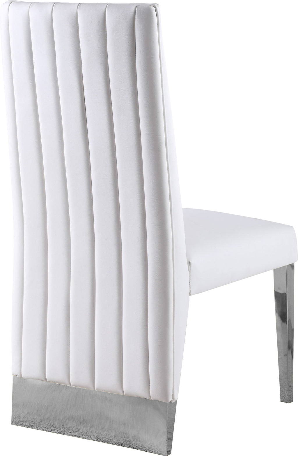 Bring the luxe look of this Porsha chair to your dining space. Impressing guests is simple when they're seated in this chair. The floor-length back is elegantly beautiful and creates a striking silhouette from every angle. Faux Leather upholstery material in a sophisticated hue of adds a touch of modernity to this chair, and the reverse is channel tufted for added elegance and refinement.