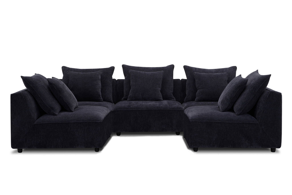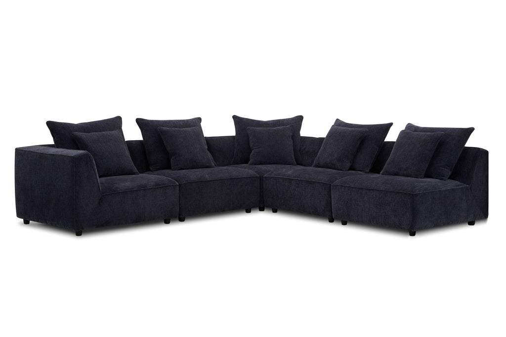 This exquisite sectional is tailored with precision and upholstered in a durable, 100-percent woven chenille fabric that boasts a velvety hand and and embossed pattern that adds and extra touch of sophistication. This sectional is designed with your ultimate comfort in mind. The comfort cushion is encased in cotton, down-proof channeled ticking to help it keep its shape and prevent feather migration. The cushions are padded with high-density Dacron and topped with sterilized down and feathers for maximum plushness. The sectional is built to last, with wood frames that feature reinforced corner blocks for lasting strength and stability. Select woods are kiln-dried to minimize warping and splitting while ensuring longevity. This attention to detail ensures that your sectional will remain sturdy and reliable. Whether you're looking for a cozy corner for movie night or a space to entertain guests, our 5-piece modular sectional has you covered. with its modular design, you can arrange the pieces to fit your space and your needs.