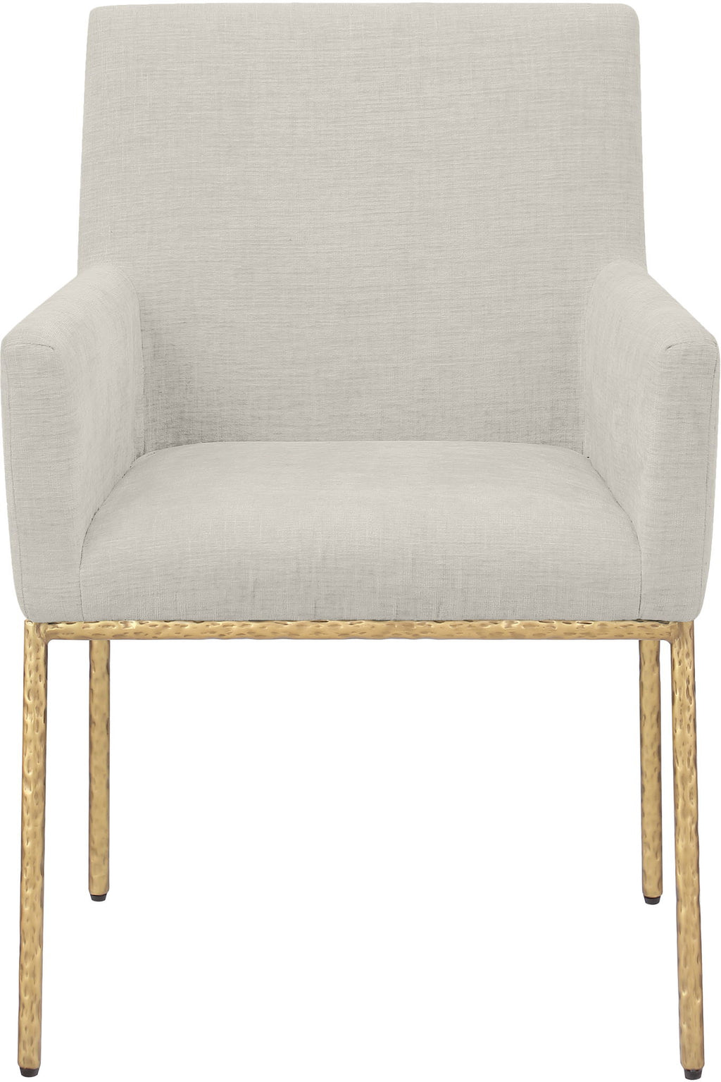 Casual comfort is the order of the day when dinner guests relax from the cozy confines of this Reeves soft chenille fabric dining chair. Sumptuously padded arms, back, and seat ensure total comfort from appetizers through dessert, and the neutral, solid-colored upholstered makes it easy to pair this dining chair with the table of your choice. An all-metal brushed brass frame and legs lend a contemporary finish and impeccable sturdiness and strength for long-term enjoyment.