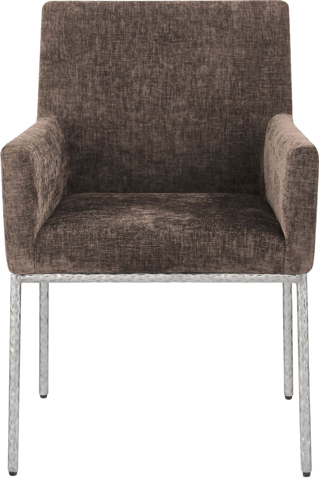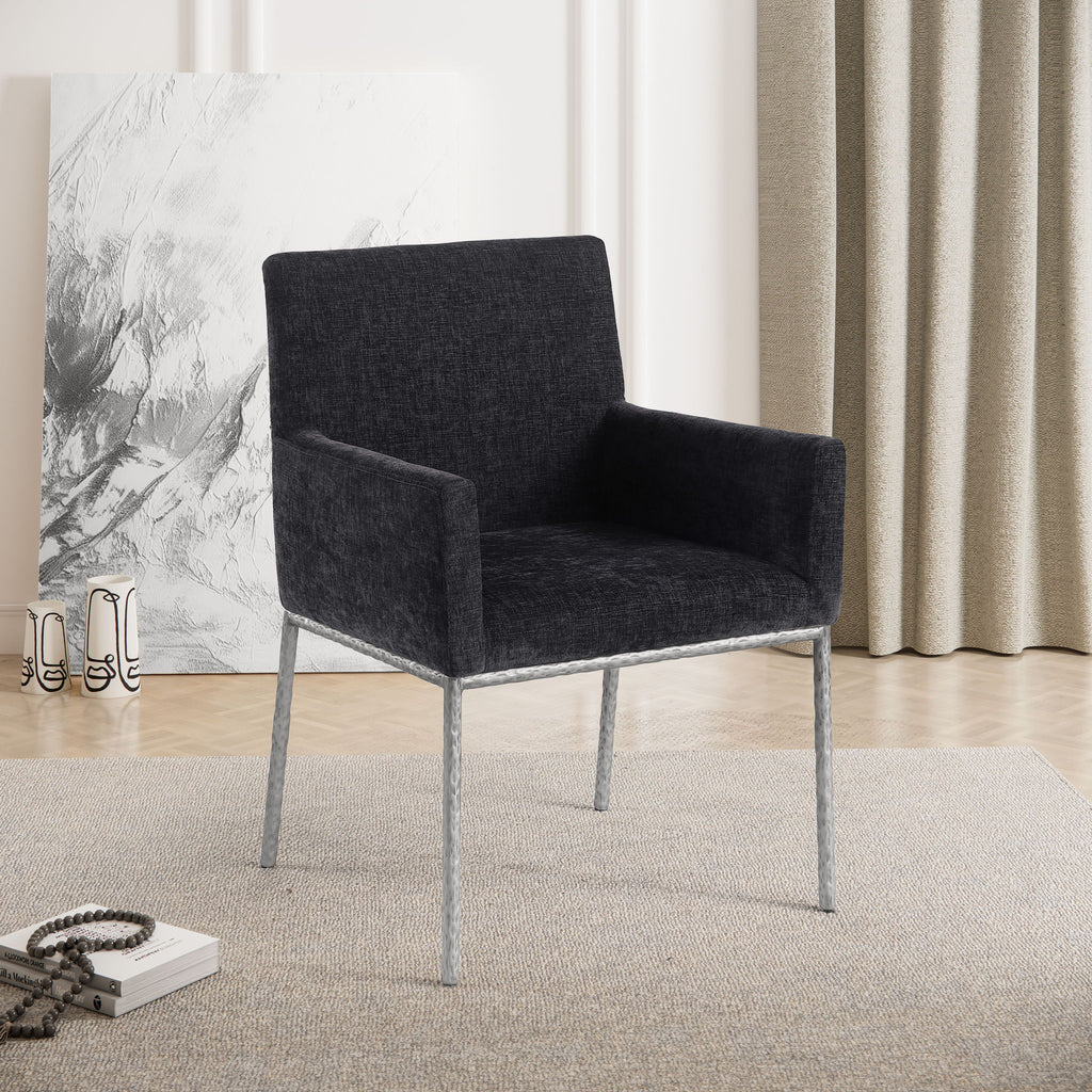 Casual comfort is the order of the day when dinner guests relax from the cozy confines of this Reeves soft chenille fabric dining chair. Sumptuously padded arms, back, and seat ensure total comfort from appetizers through dessert, and the neutral, solid-colored upholstered makes it easy to pair this dining chair with the table of your choice. An all-metal brushed silver frame and legs lend a contemporary finish and impeccable sturdiness and strength for long-term enjoyment.