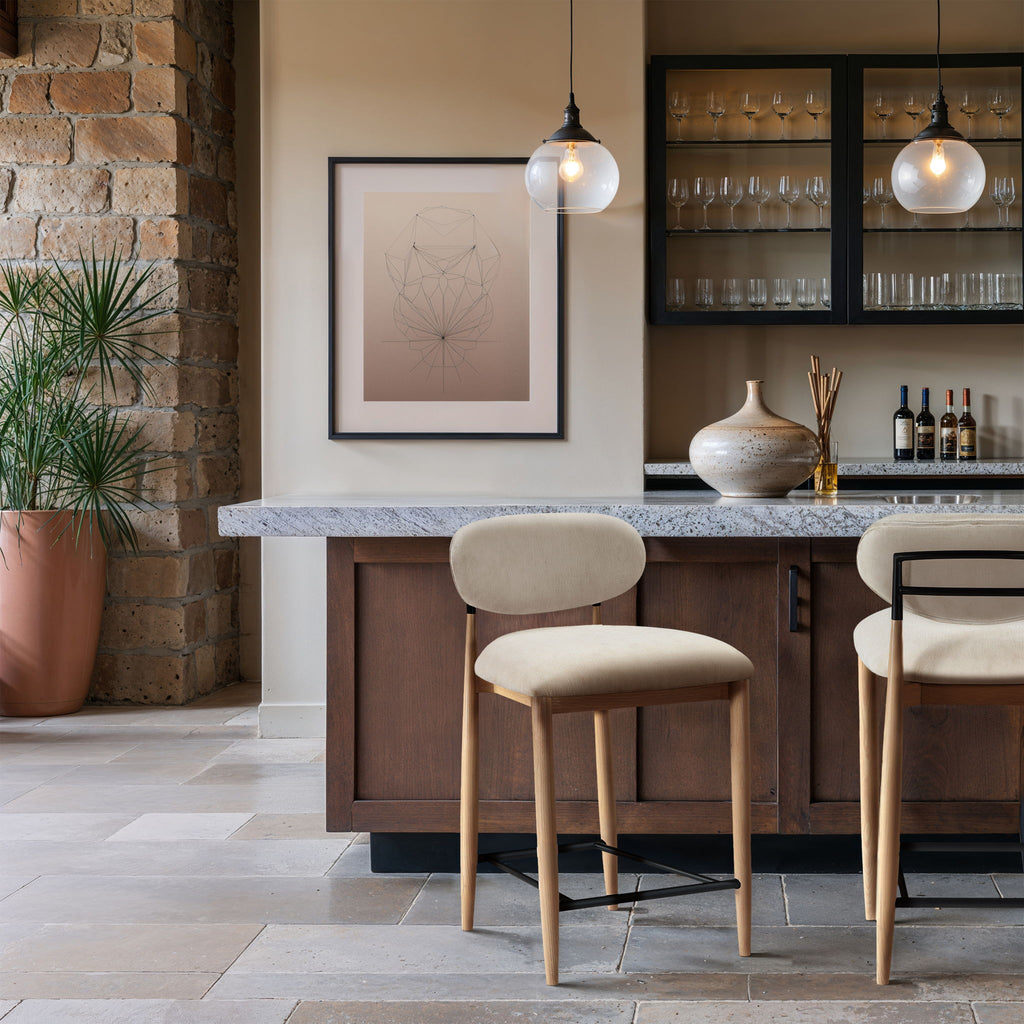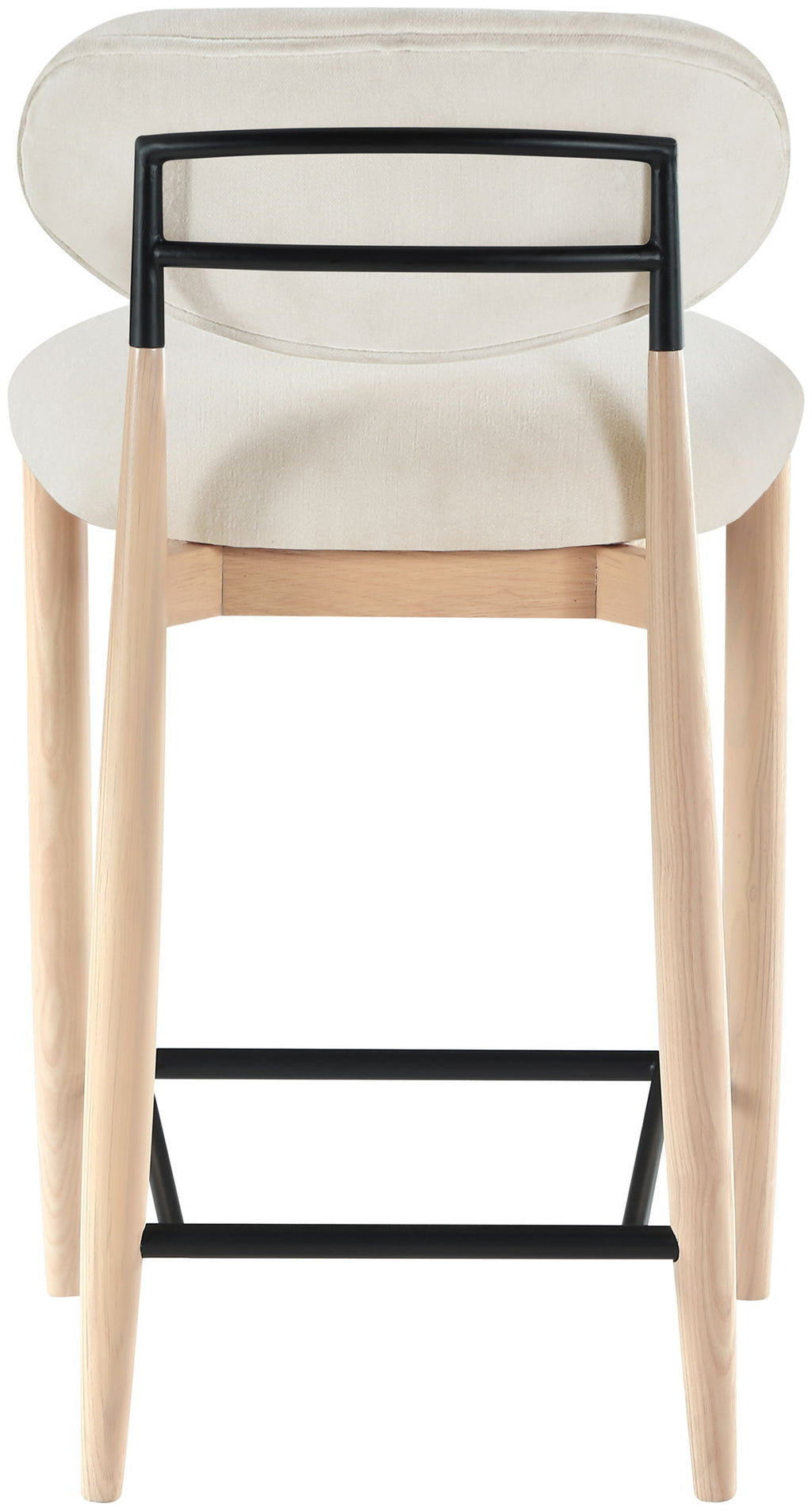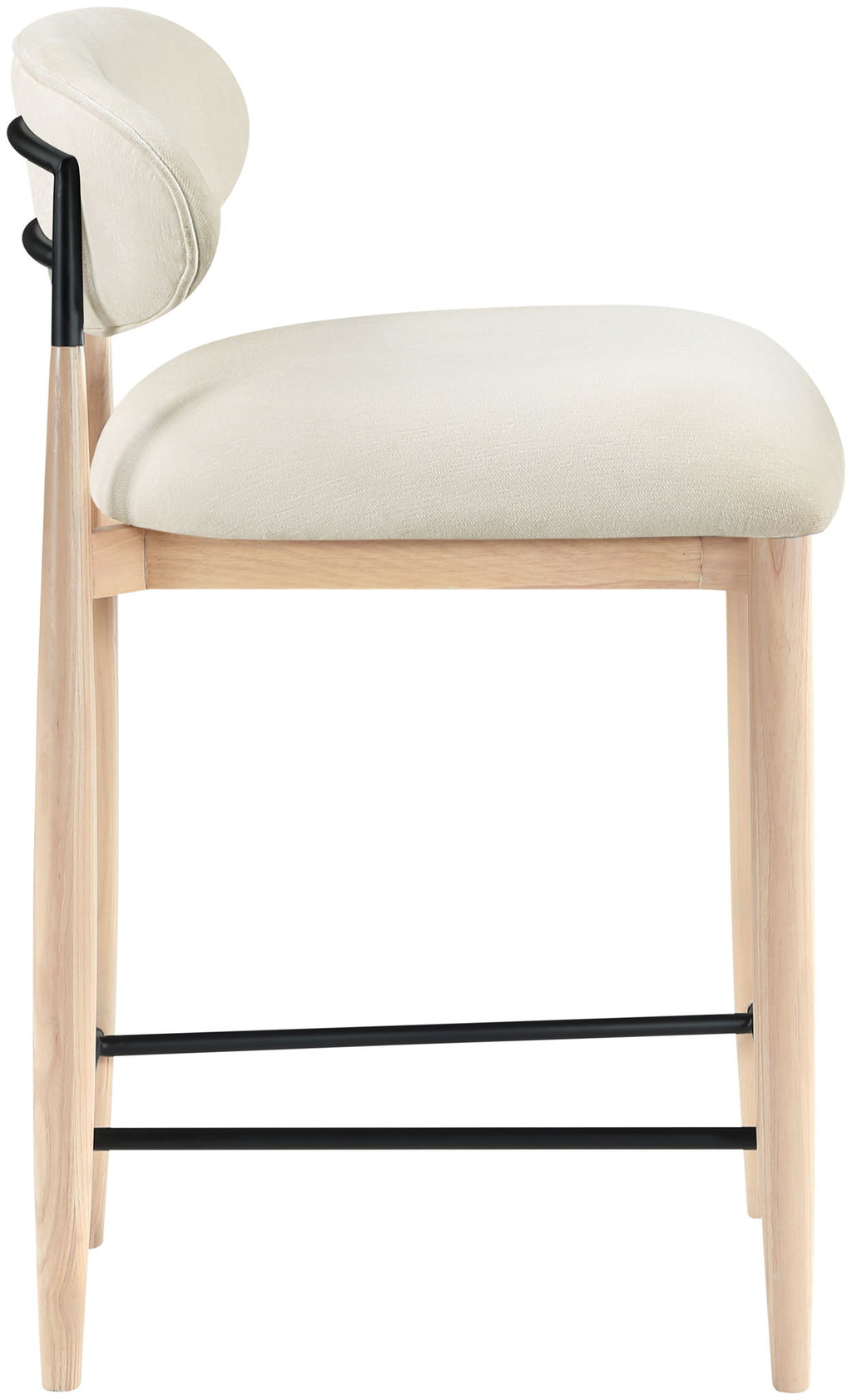Wrapped in smooth cream polyester, the Riccio upholstered counter stool blends modern refinement with organic warmth. A natural wood frame and matte black iron accents create a striking play of textures. Designed for comfort and style, it elevates any dining space with ease.