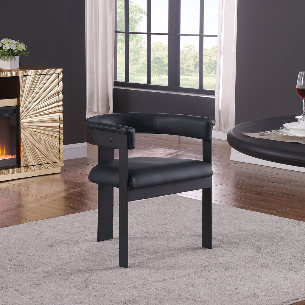 Rehab your dining area with these Romeo vegan leather dining chairs, sold as a set of two. These chairs offer both style and comfort, with soft vegan leather seats and backs providing a sleek and inviting look that meshes well with an array of dining tables. The matte black metal frame ensures durability and modern aesthetic appeal, while the chairs' curved backs deliver lumbar support for a relaxed dining experience.