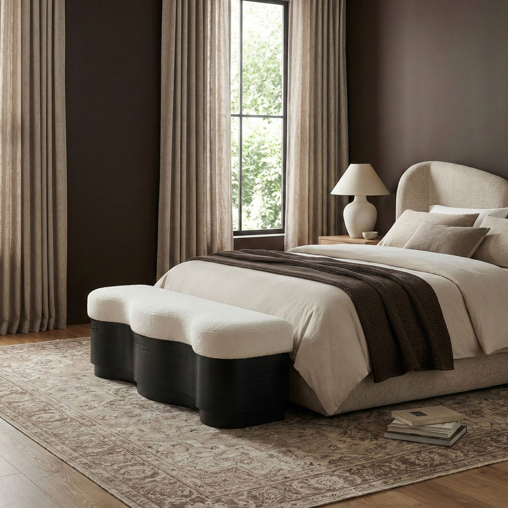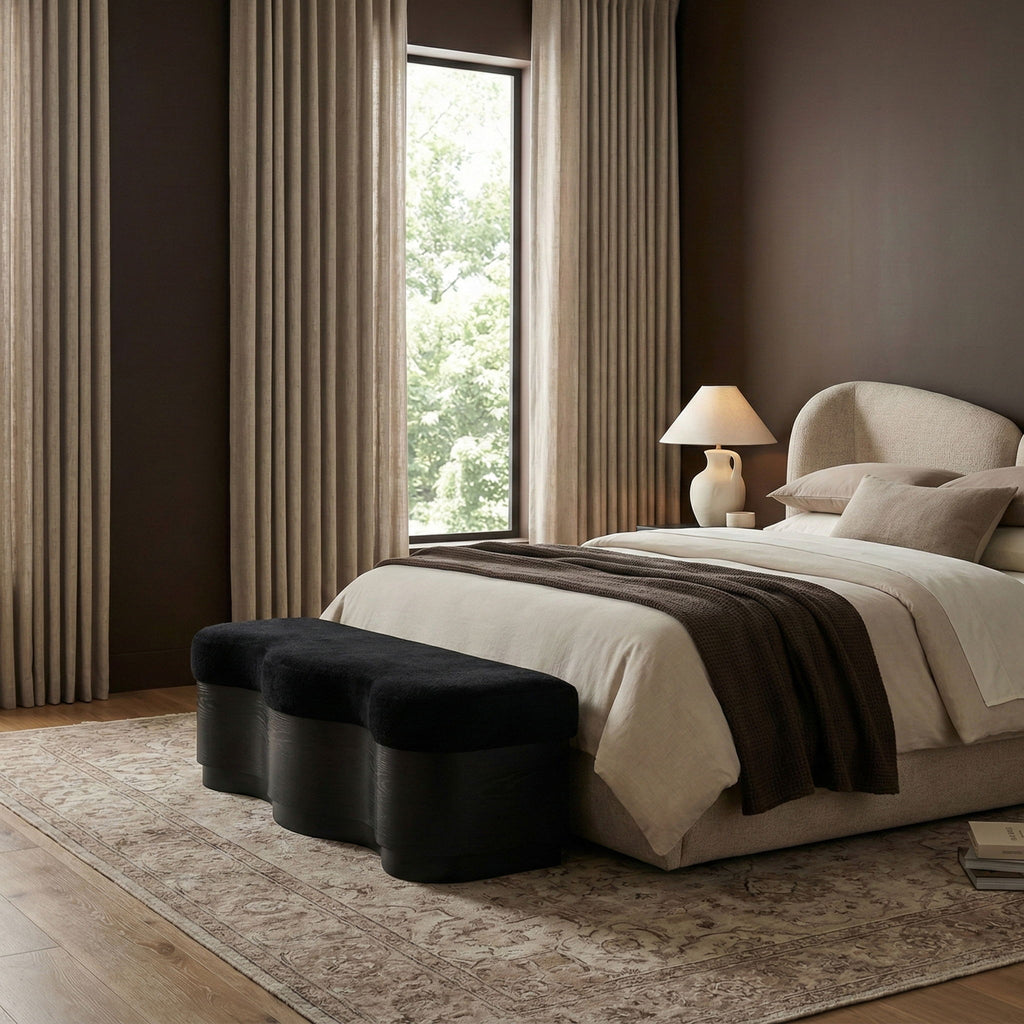 The bold and artistic Savoy velour fur fabric upholstered bench brings a unique wave-like design to your space. Plush velour fur fabric atop creates a soft, luxurious seating experience, while the sculptural wooden base in a rich finish adds a playful yet sophisticated touch. Perfect for those seeking to make a statement, it blends form and function, offering comfort and style in one eye-catching piece.