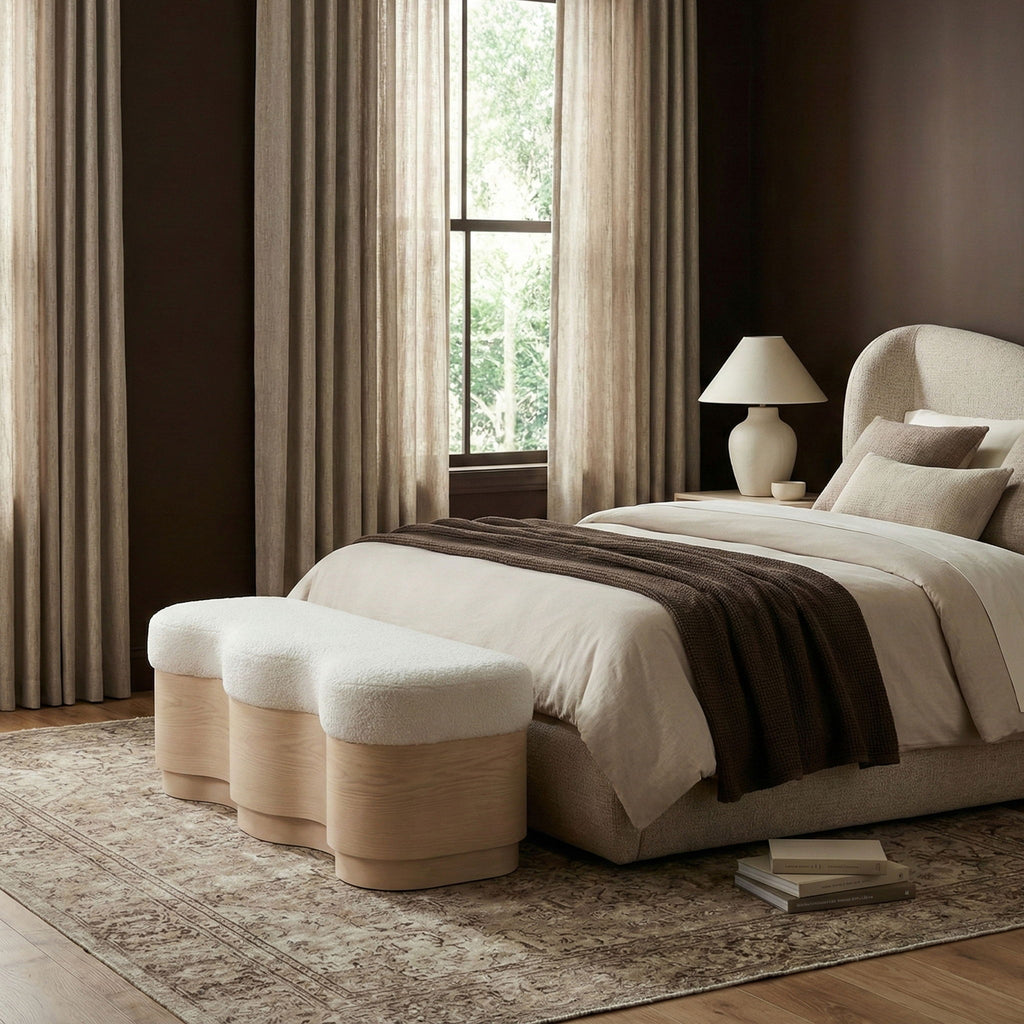 The bold and artistic Savoy velour fur fabric upholstered bench brings a unique wave-like design to your space. Plush velour fur fabric atop creates a soft, luxurious seating experience, while the sculptural wooden base in a natural finish adds a playful yet sophisticated touch. Perfect for those seeking to make a statement, it blends form and function, offering comfort and style in one eye-catching piece.